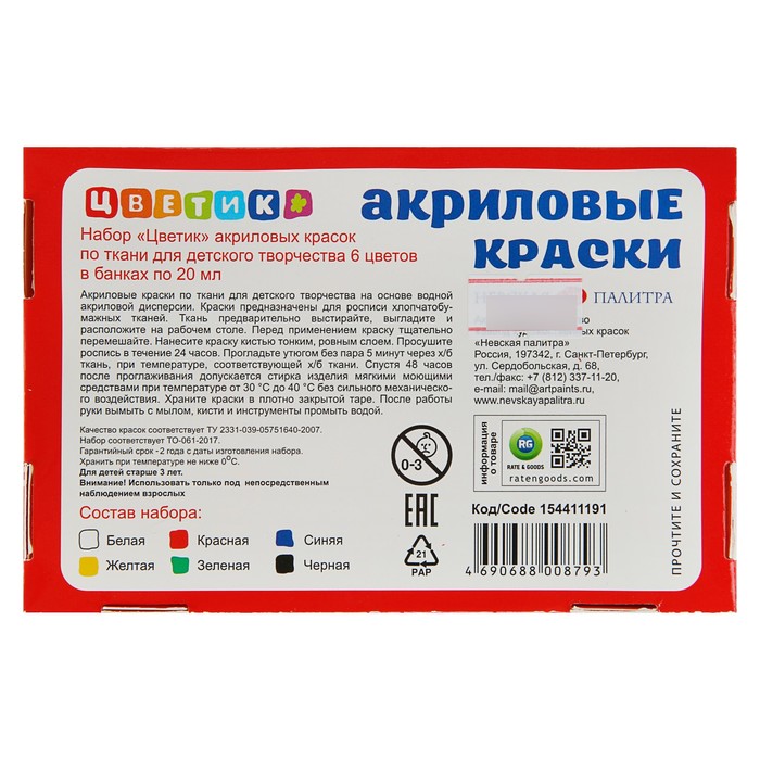 Краска для ткани акриловая набор 6 цветов х 20 мл ЗКХ Цветик 154411191