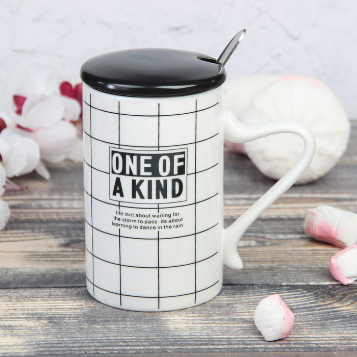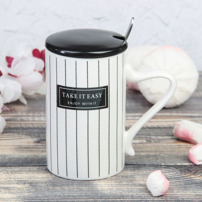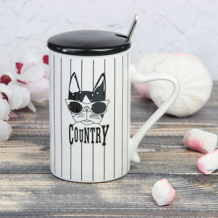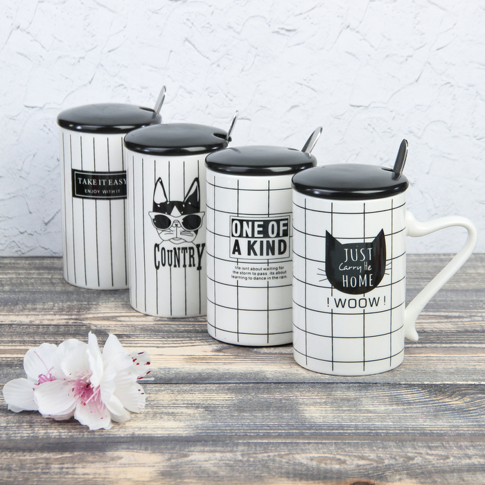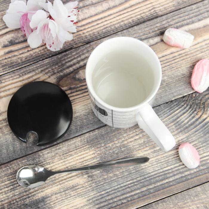 Кружка 300 мл "Маленький городок", с керамической крышкой и ложкой, рисунок МИКС