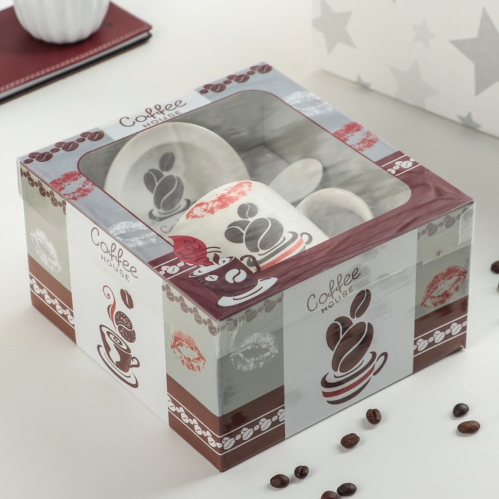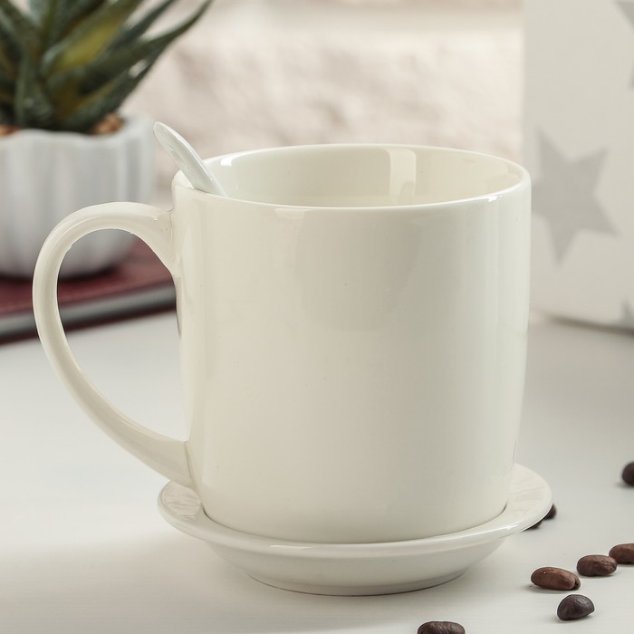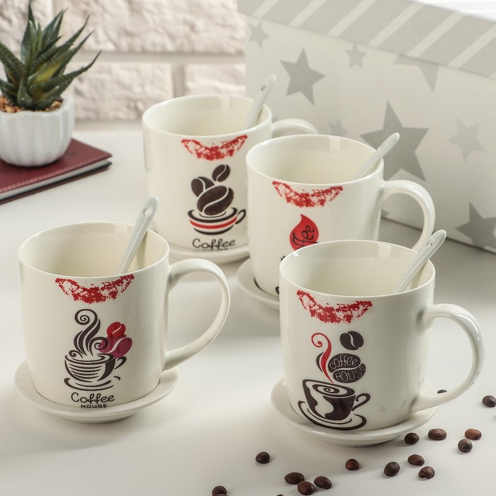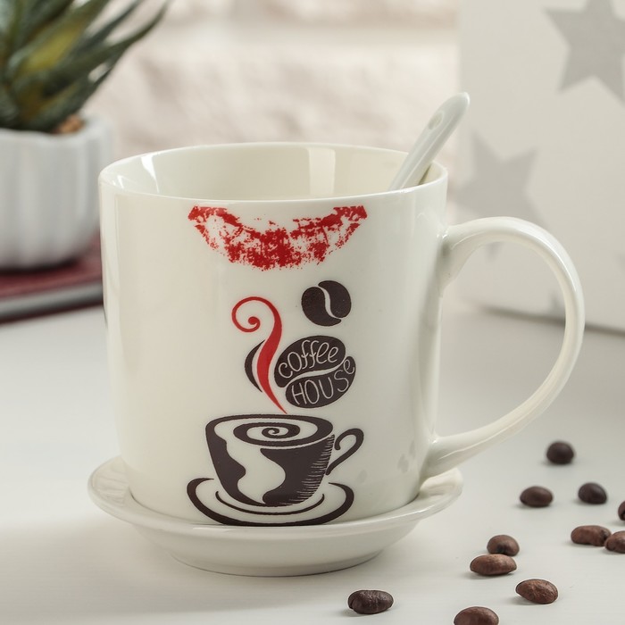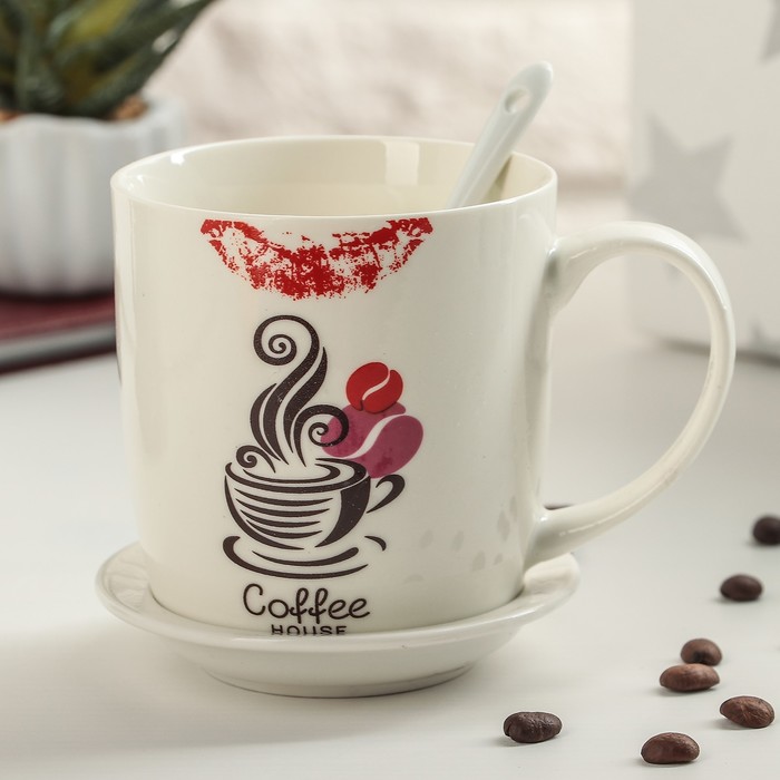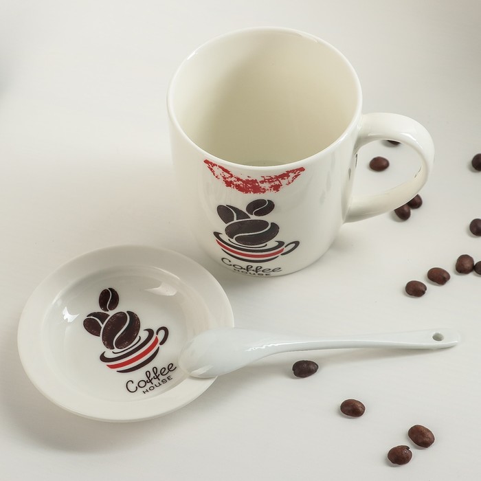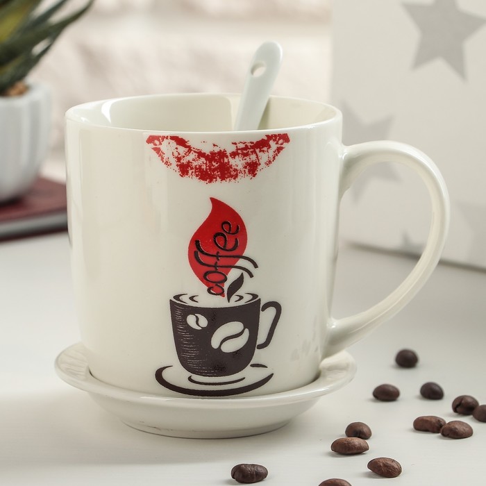 Кружка 320 мл "Кофейная любовь", с подставкой и ложкой, рисунок МИКС