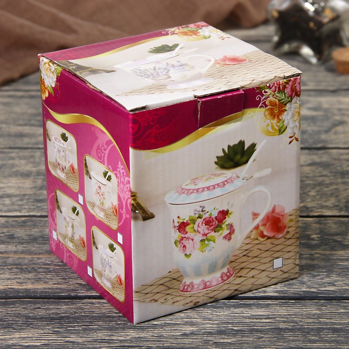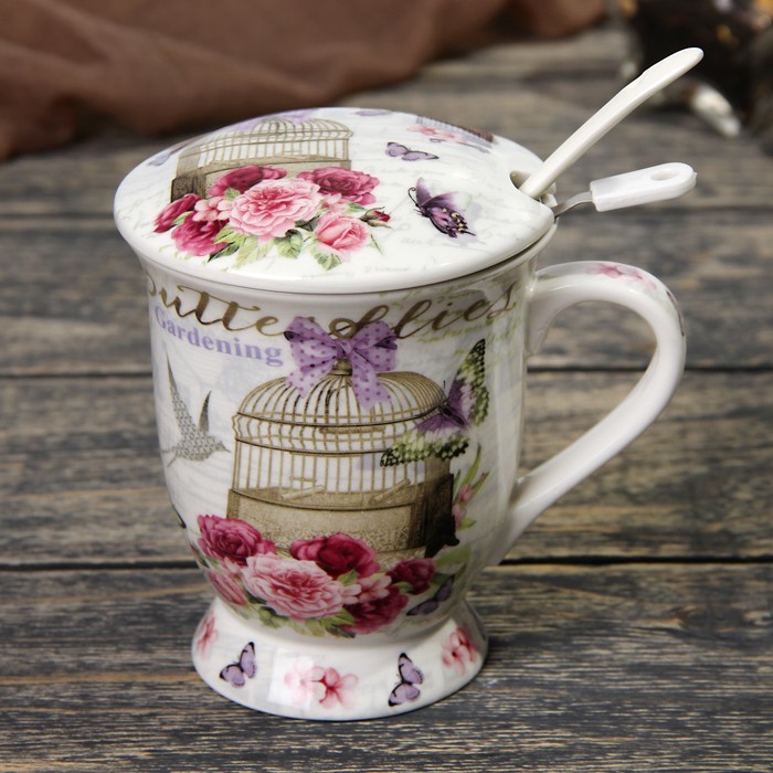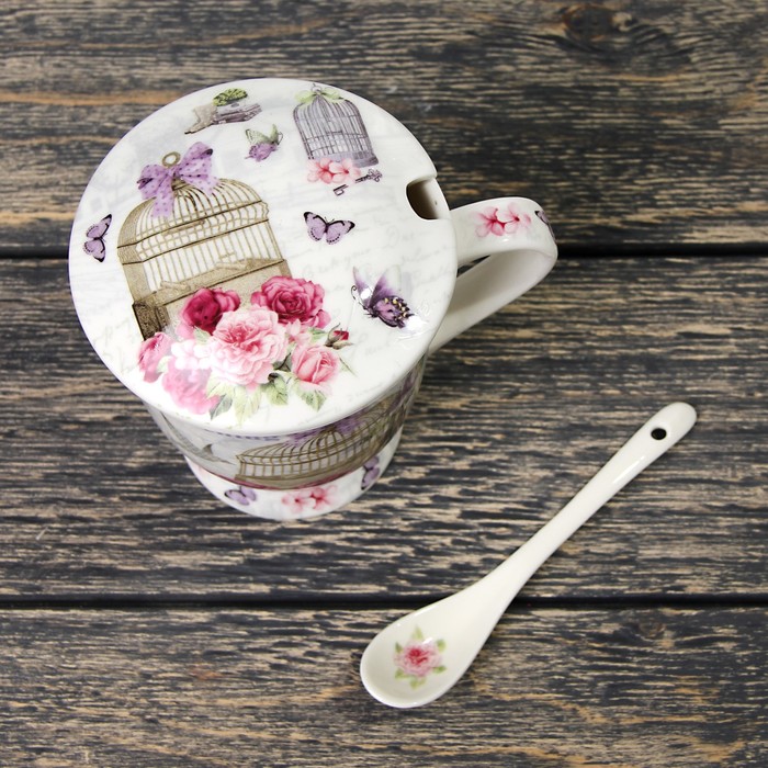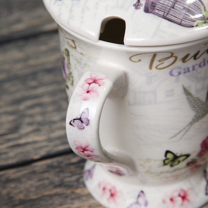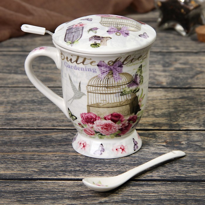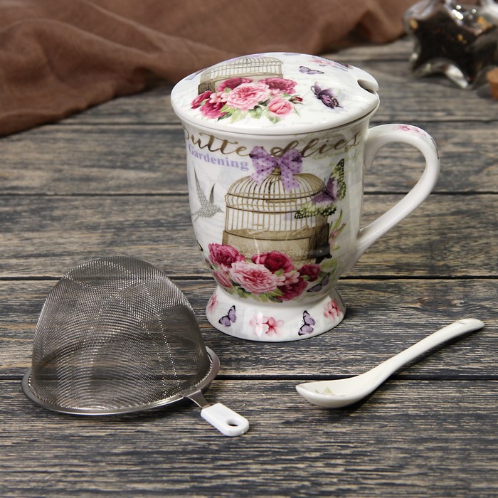 Кружка 350 мл "Цветочный сад", с ситом, ложкой и крышкой