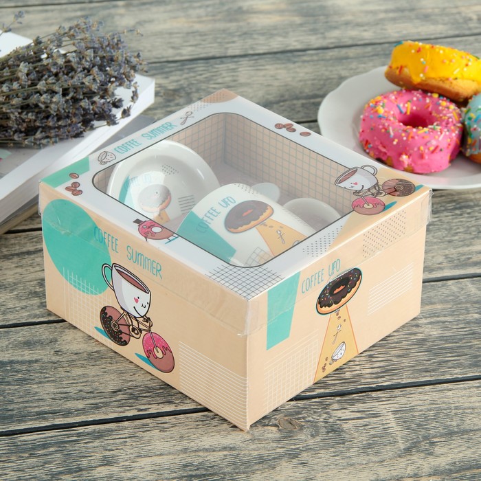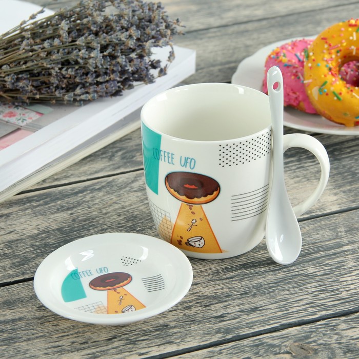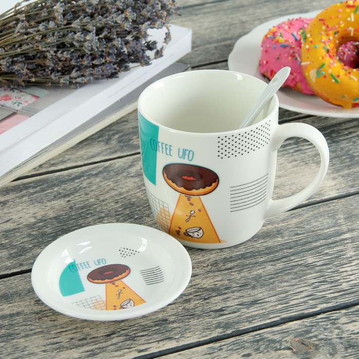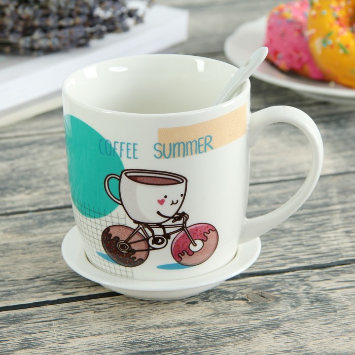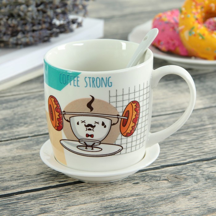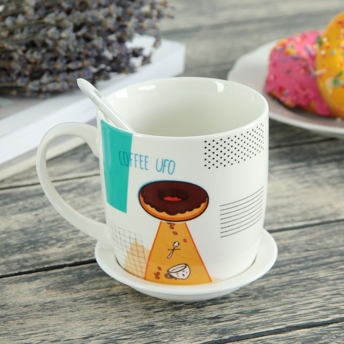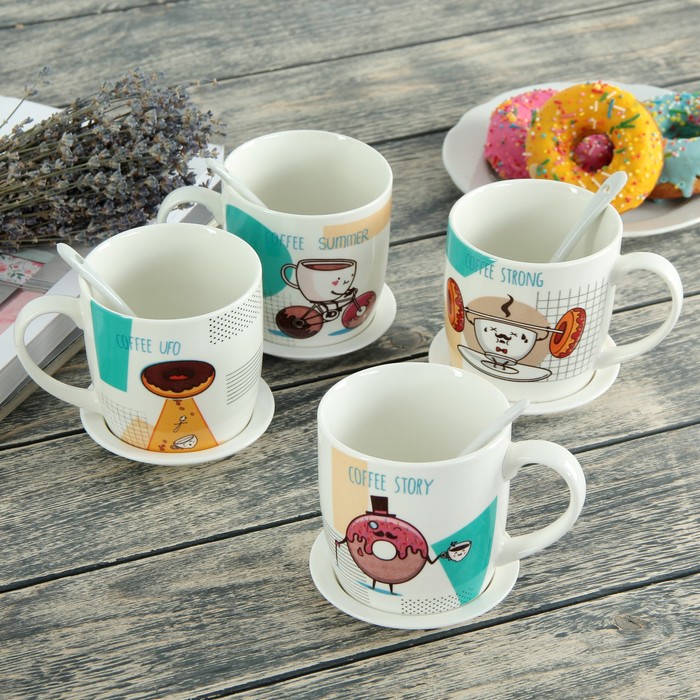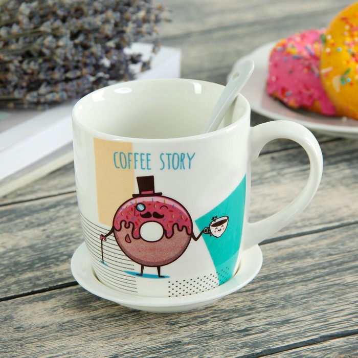 Кружка 350 мл "Кофейная история", с подставкой и ложкой, рисунок МИКС