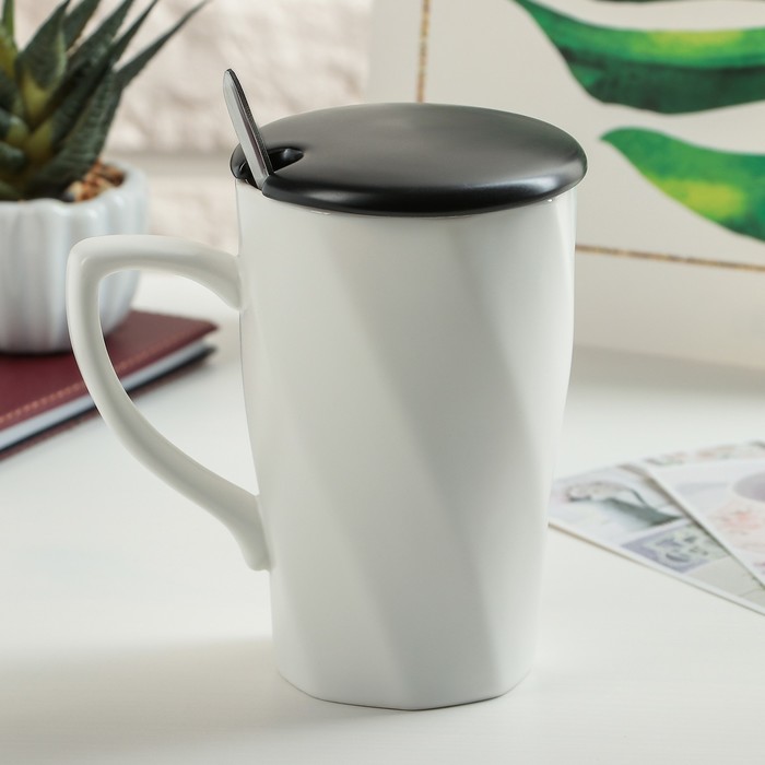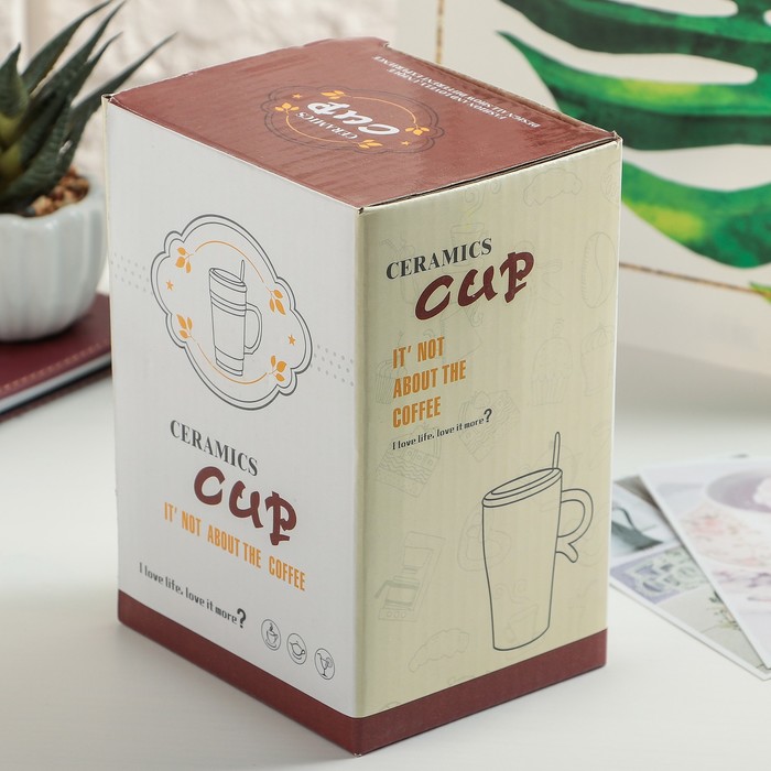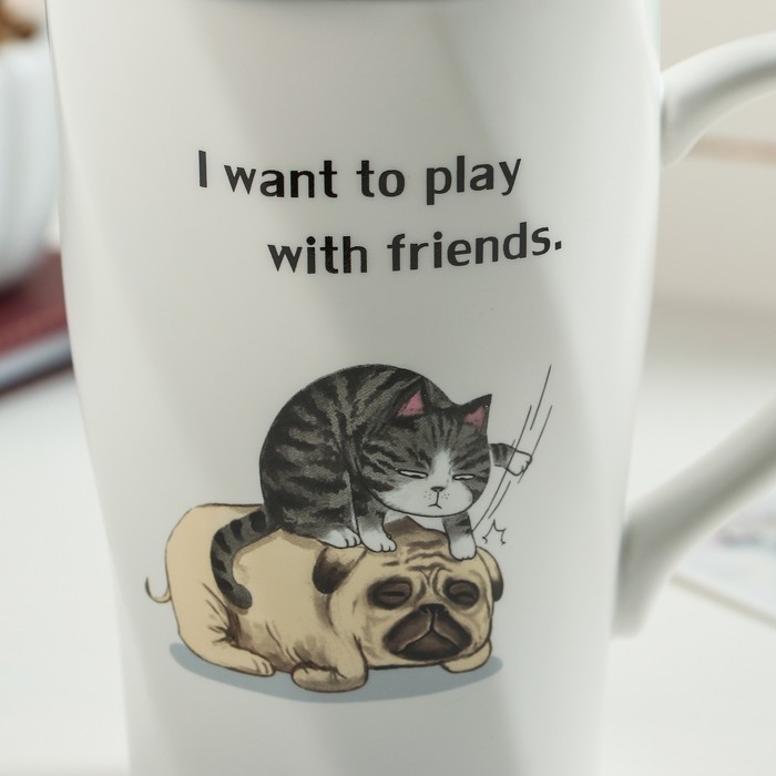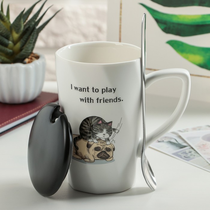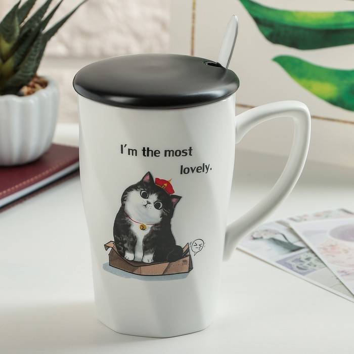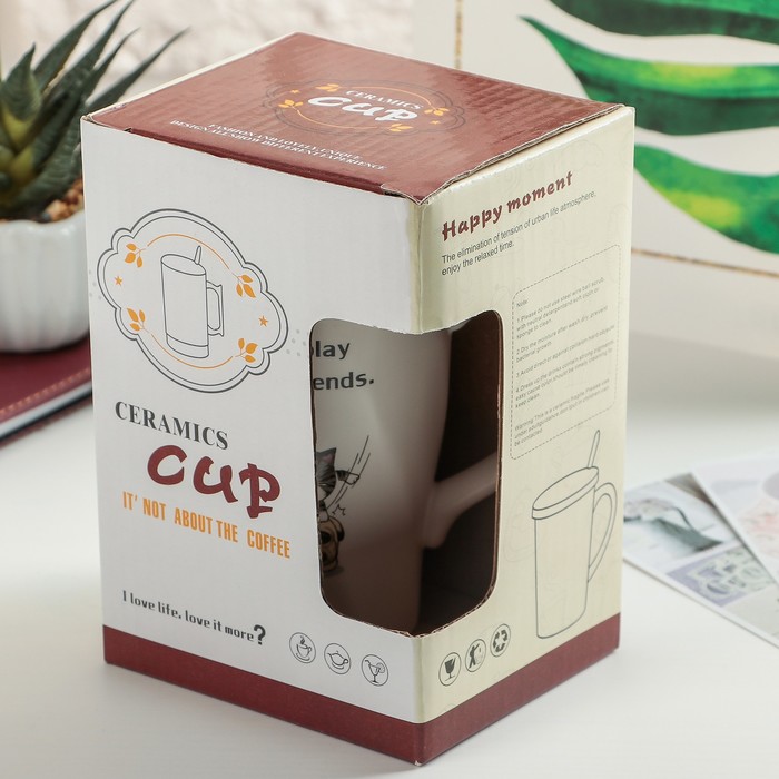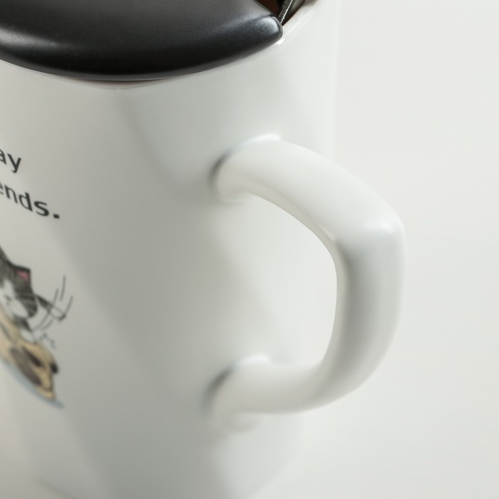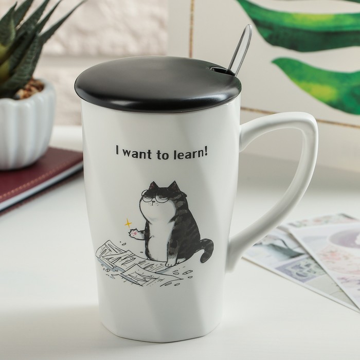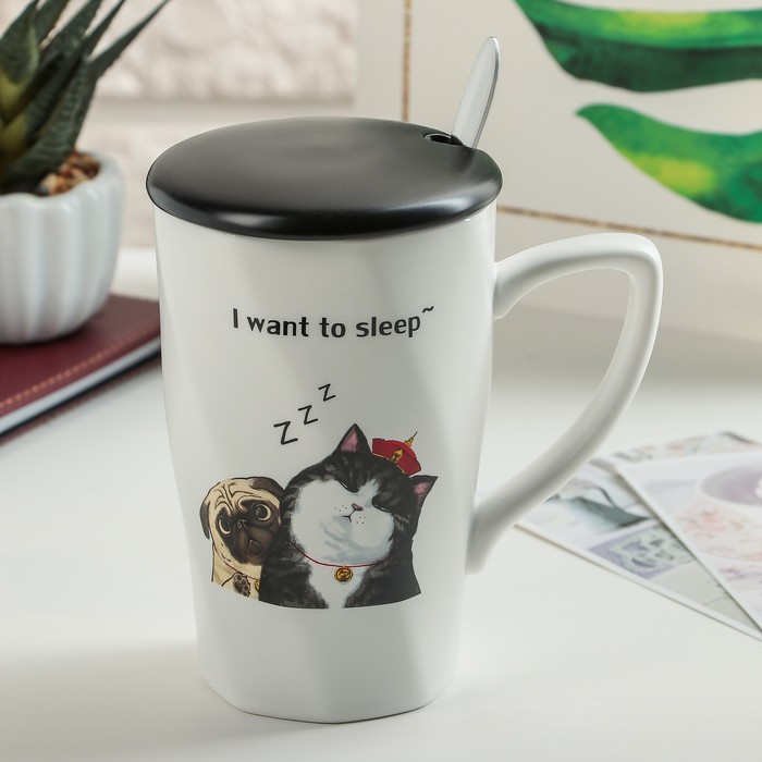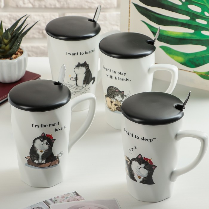Кружка 350 мл "Кот-баюн", с керамической крышкой и ложкой, рисунок МИКС