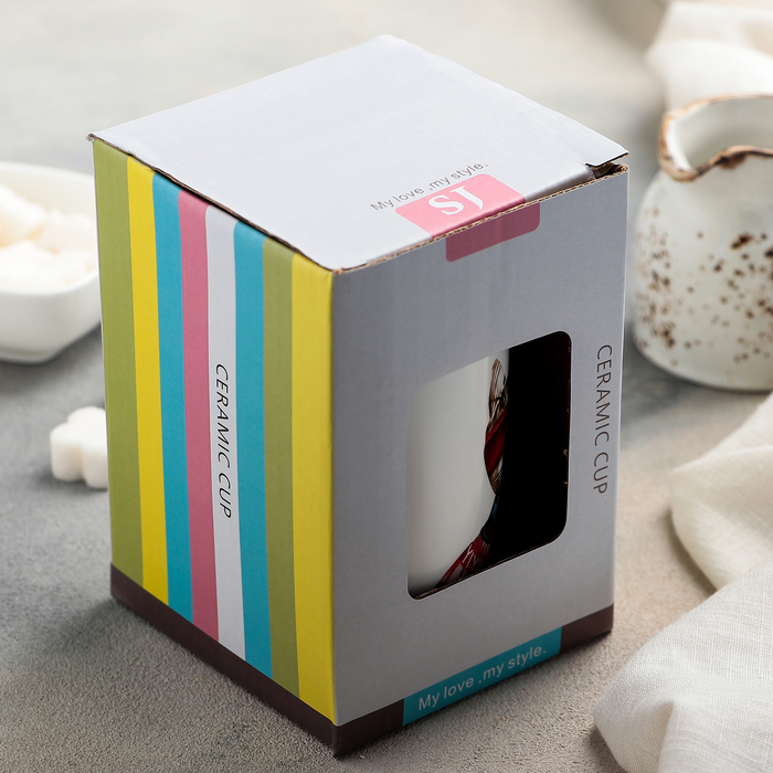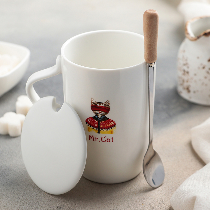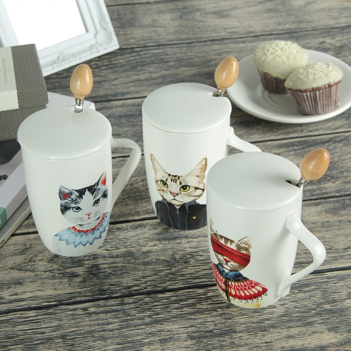 Кружка 350 мл "Котик", с керамической крышкой и ложкой, цвета МИКС