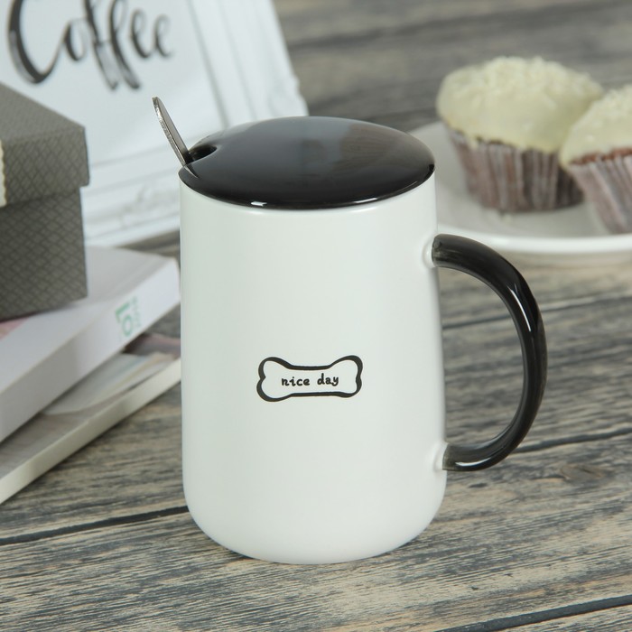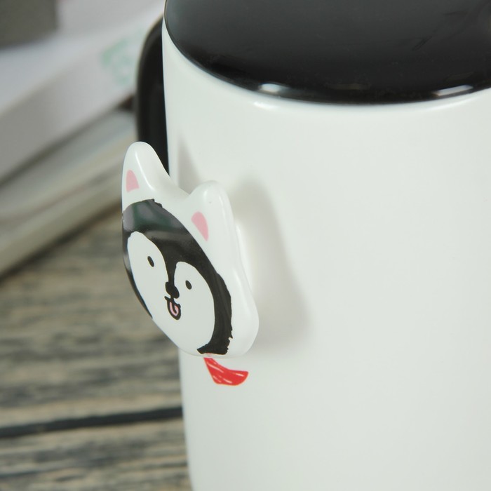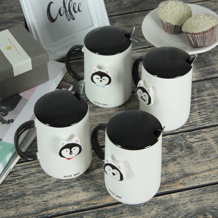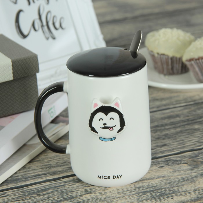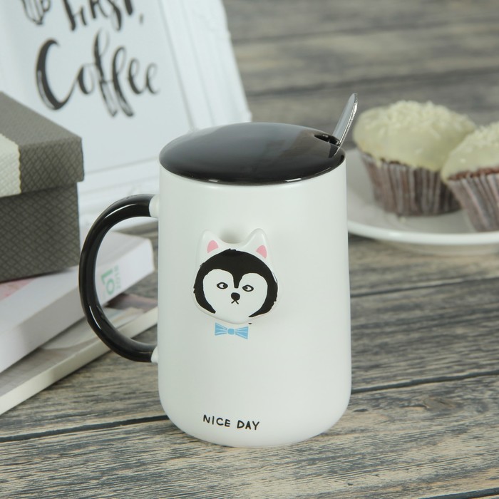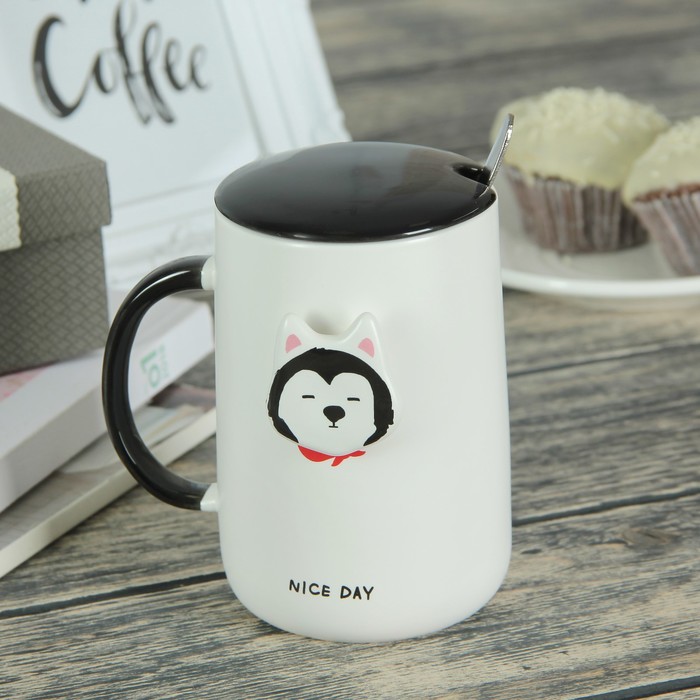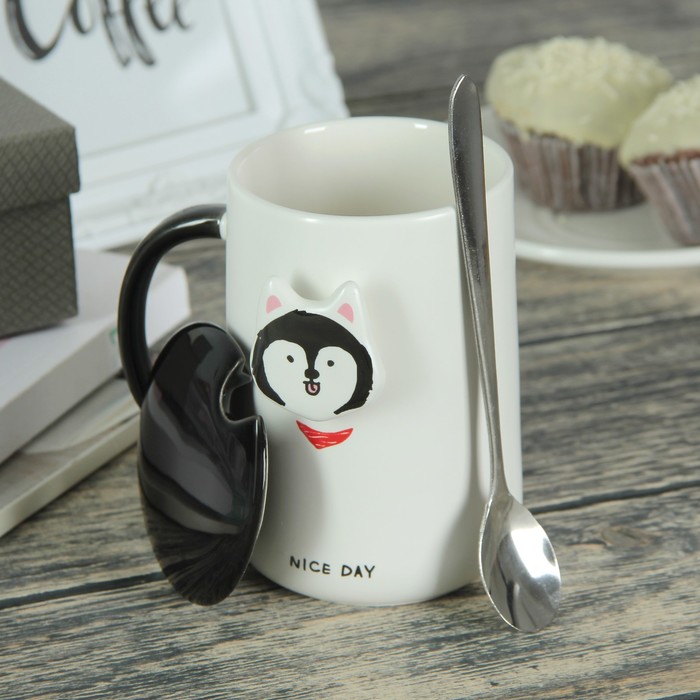 Кружка 350 мл "Пес", с керамической крышкой и ложкой, рисунок МИКС