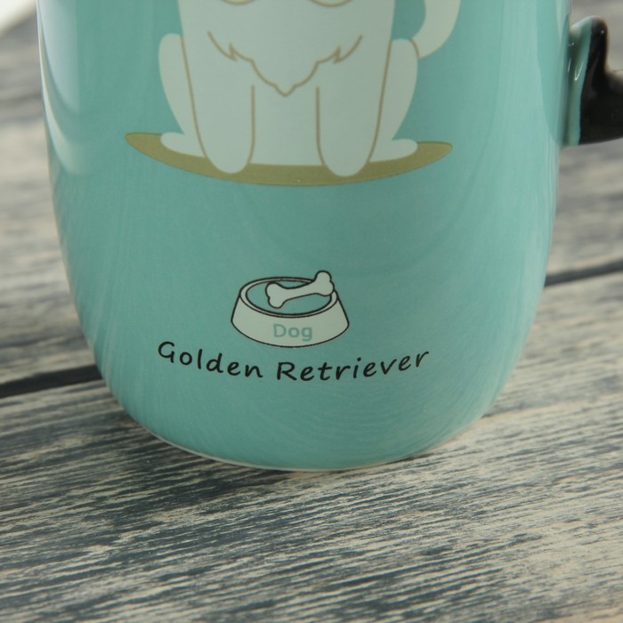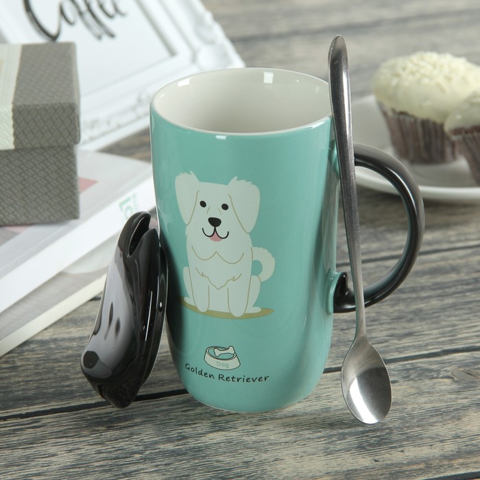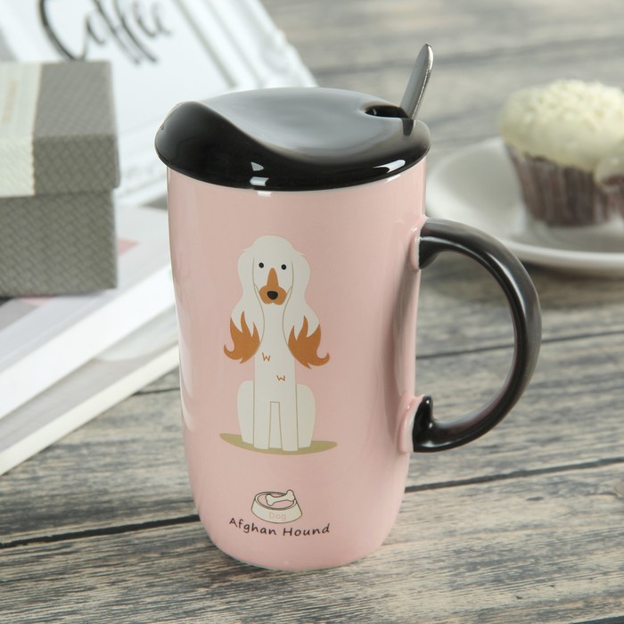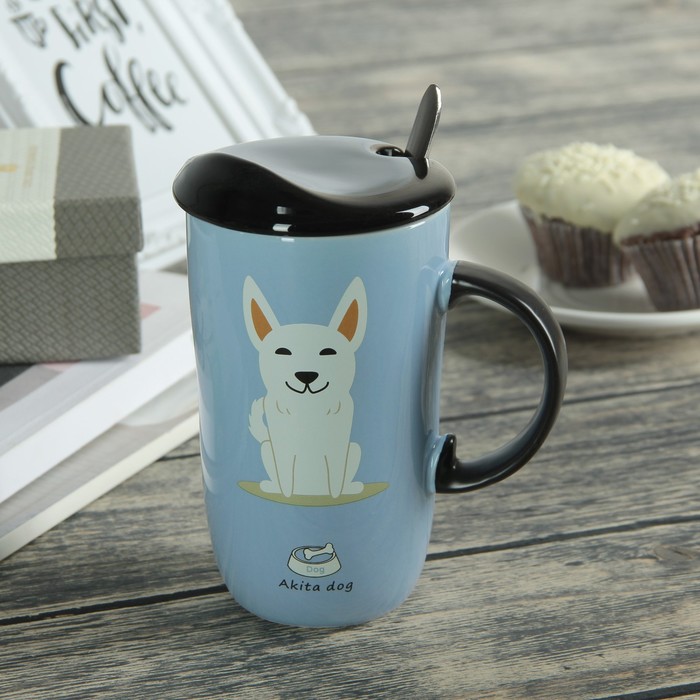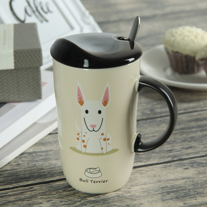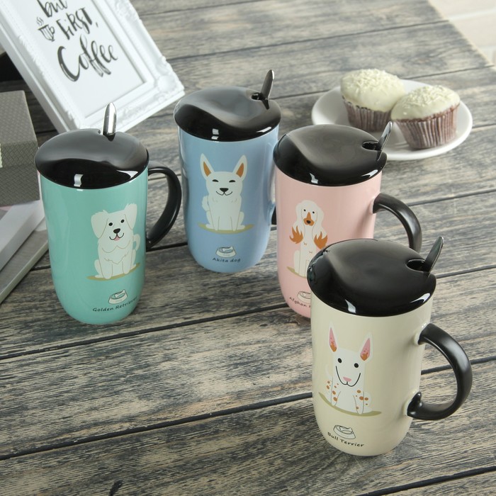 Кружка 350 мл "Пёсик", с керамической крышкой и ложкой, рисунок и цвета МИКС