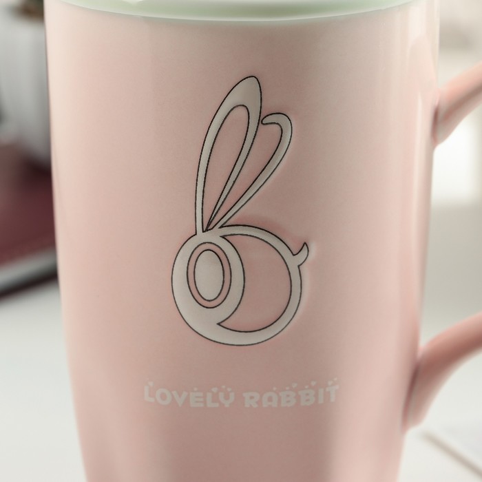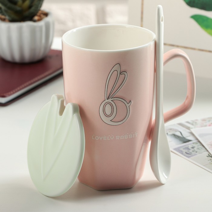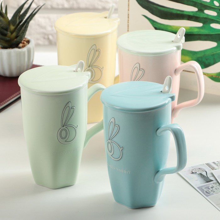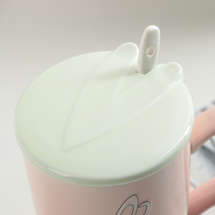 Кружка 350 мл "Заяц", с керамической крышкой и ложкой, цвета МИКС