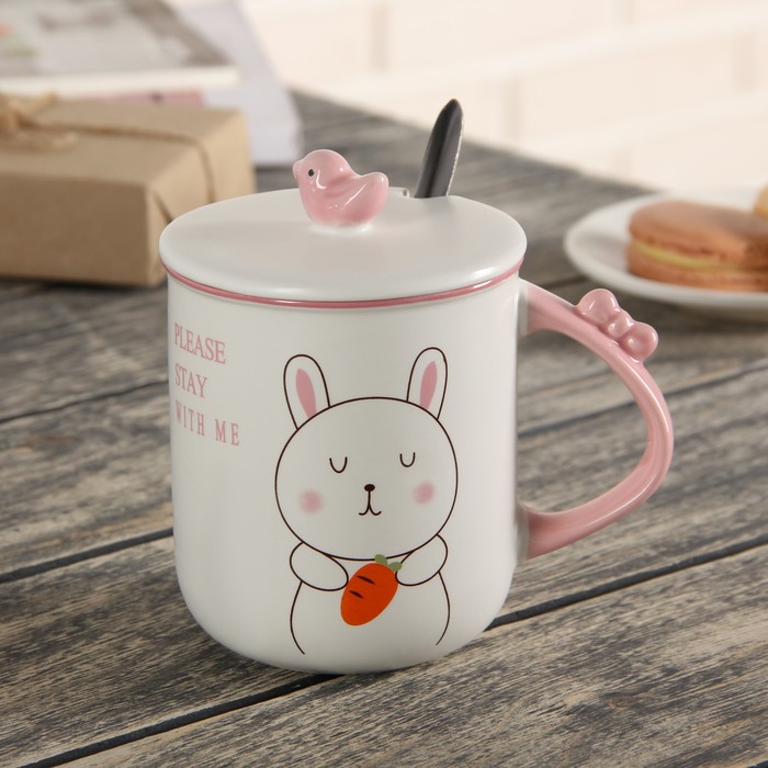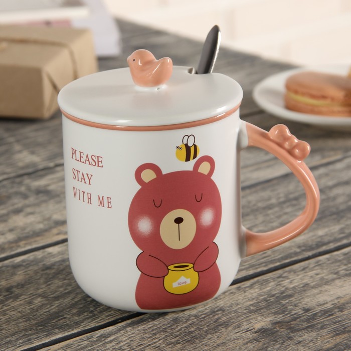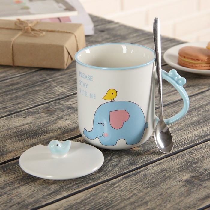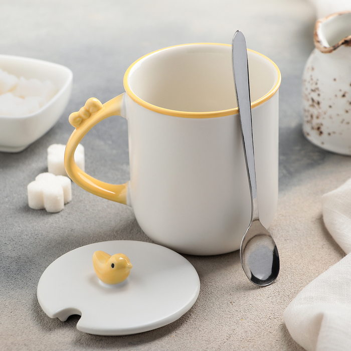 Кружка 380 мл "Над облаками", с керамической крышкой и ложкой, рисунок МИКС