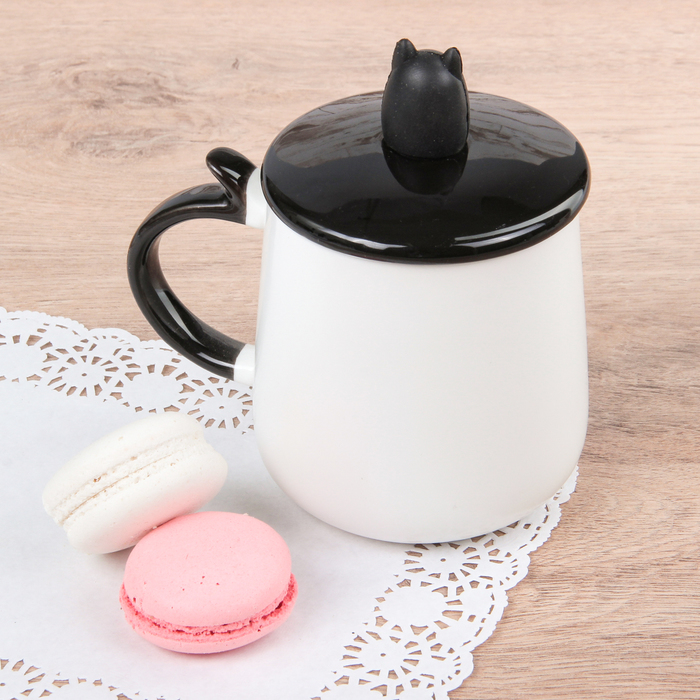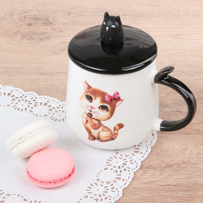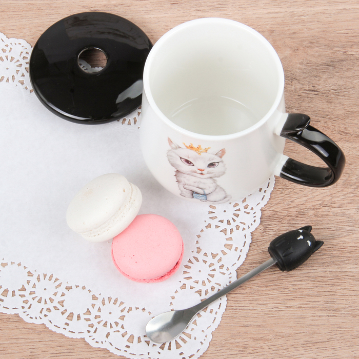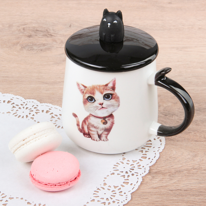 Кружка 400 мл "Кошачий рай", с керамической крышкой и ложкой, рисунок МИКС