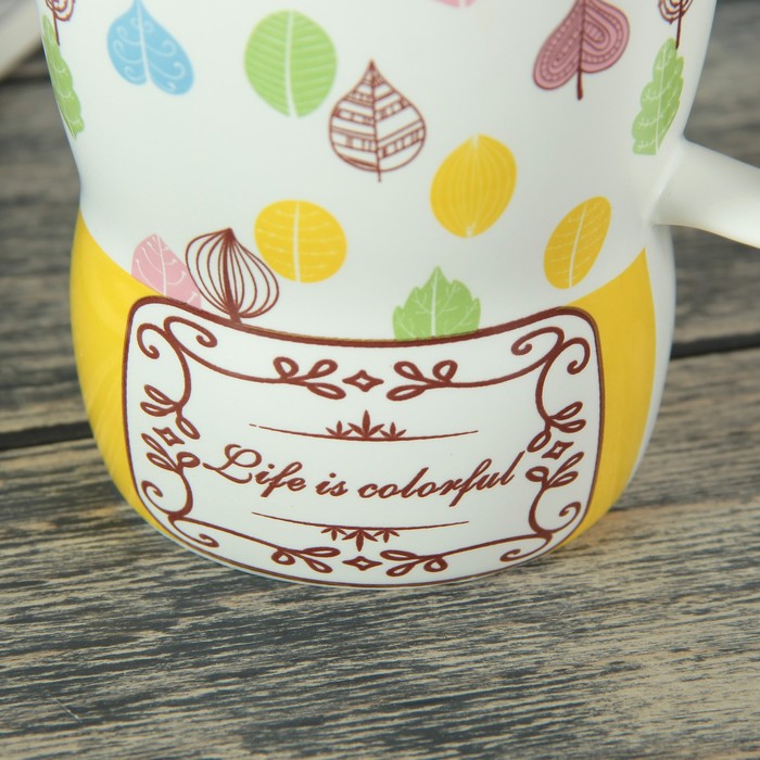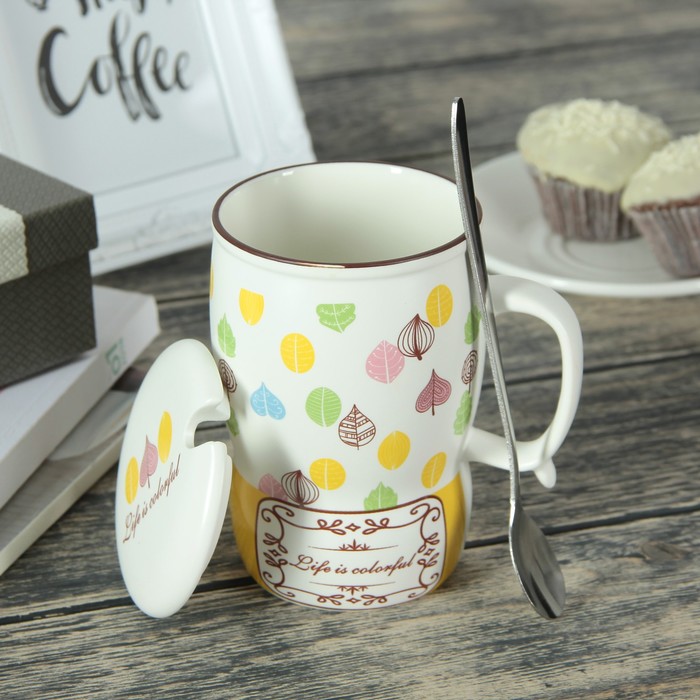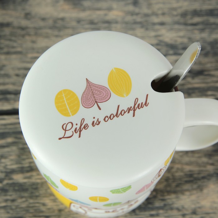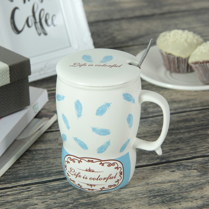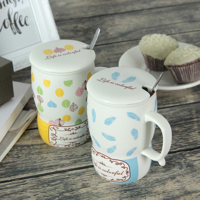 Кружка 400 мл "Перышко", с керамической крышкой и ложкой, рисунок и цвета МИКС