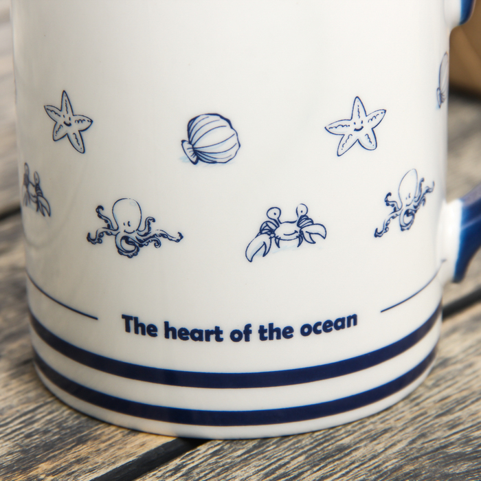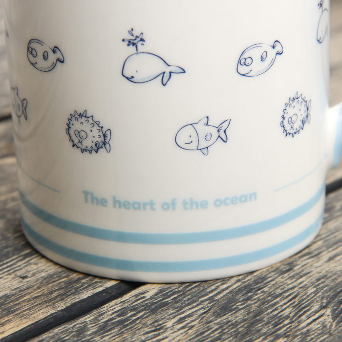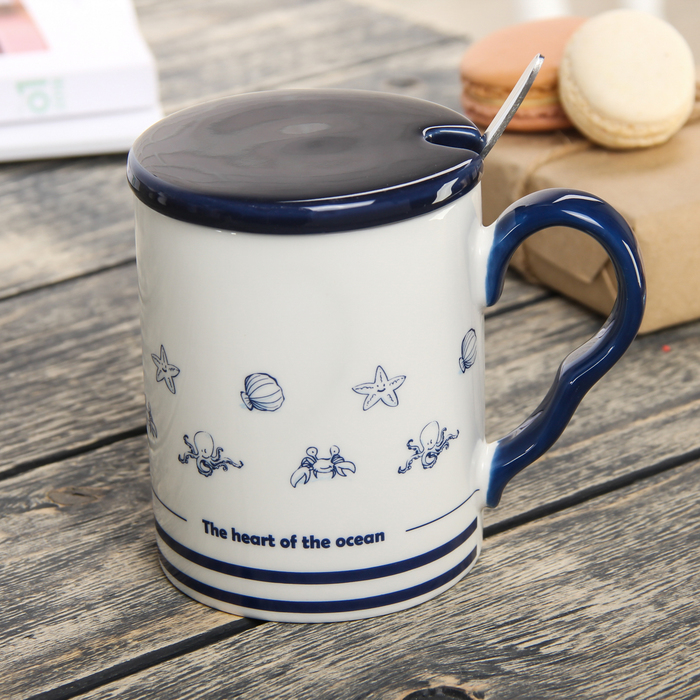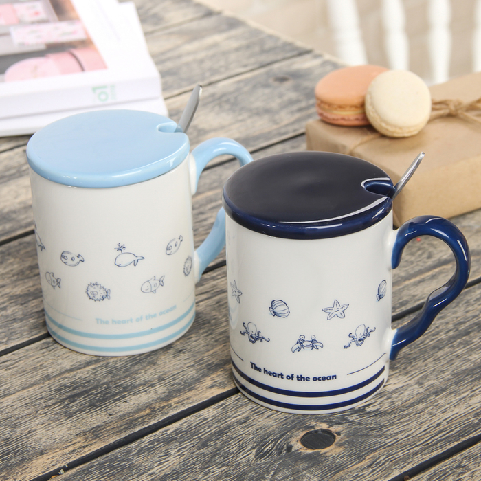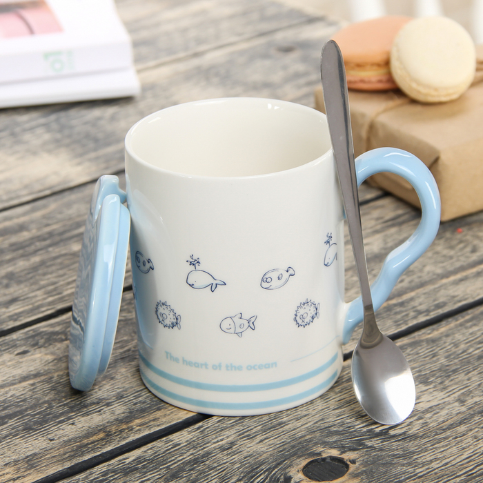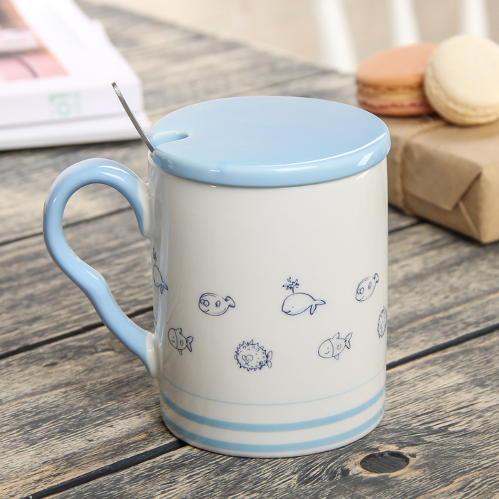 Кружка 400 мл "Рыбки", с керамической ложкой и крышкой, цвета МИКС