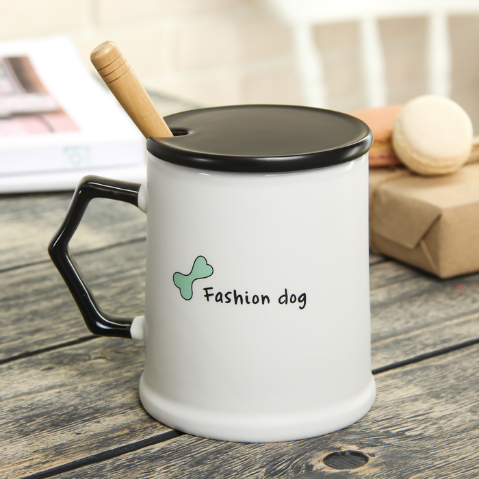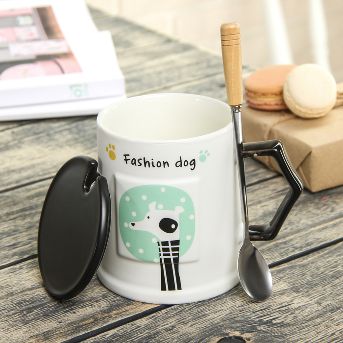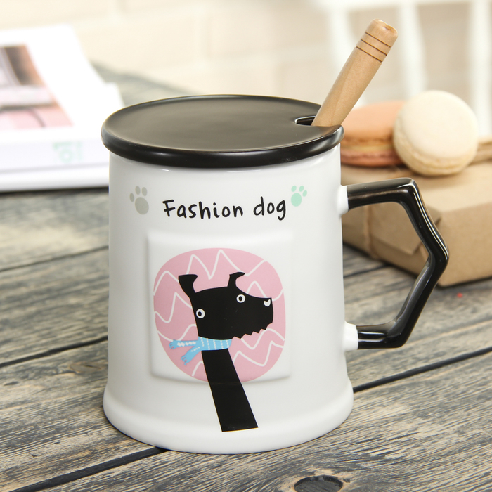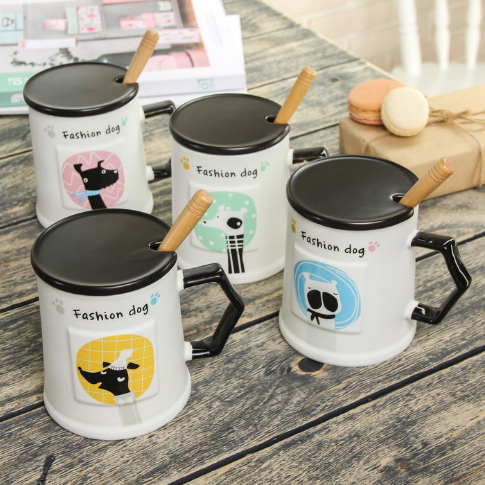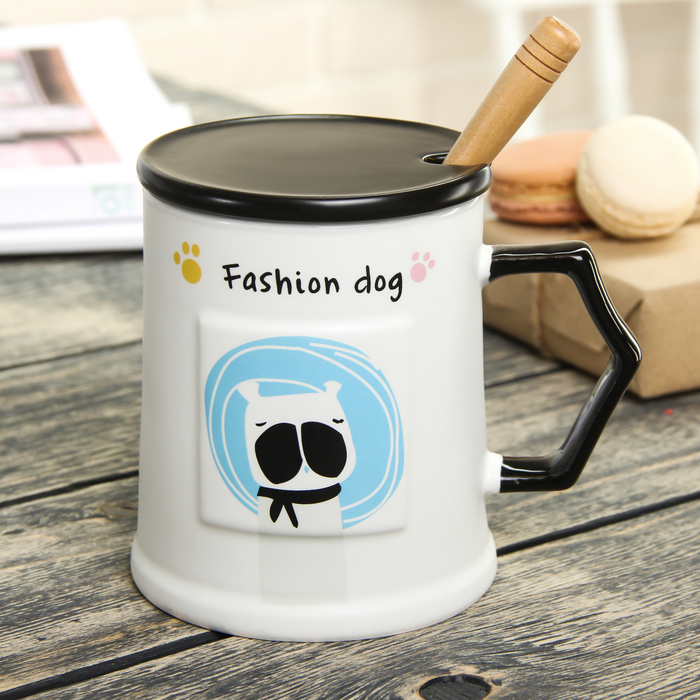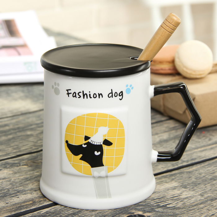 Кружка 400 мл "Собака на стиле", с керамической крышкой и ложкой, рисунок МИКС