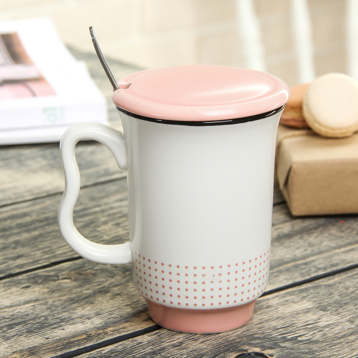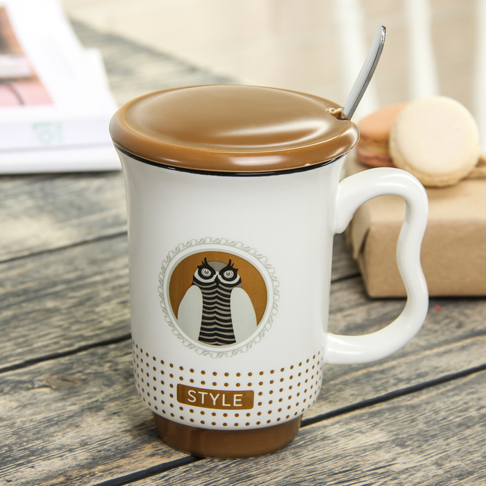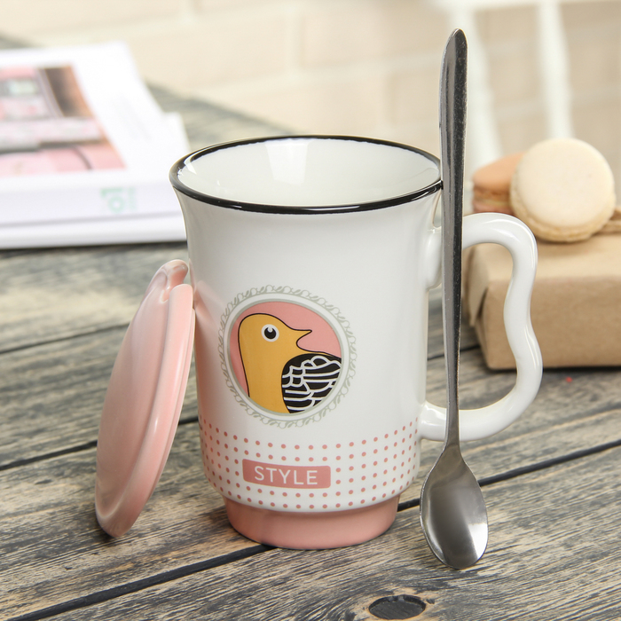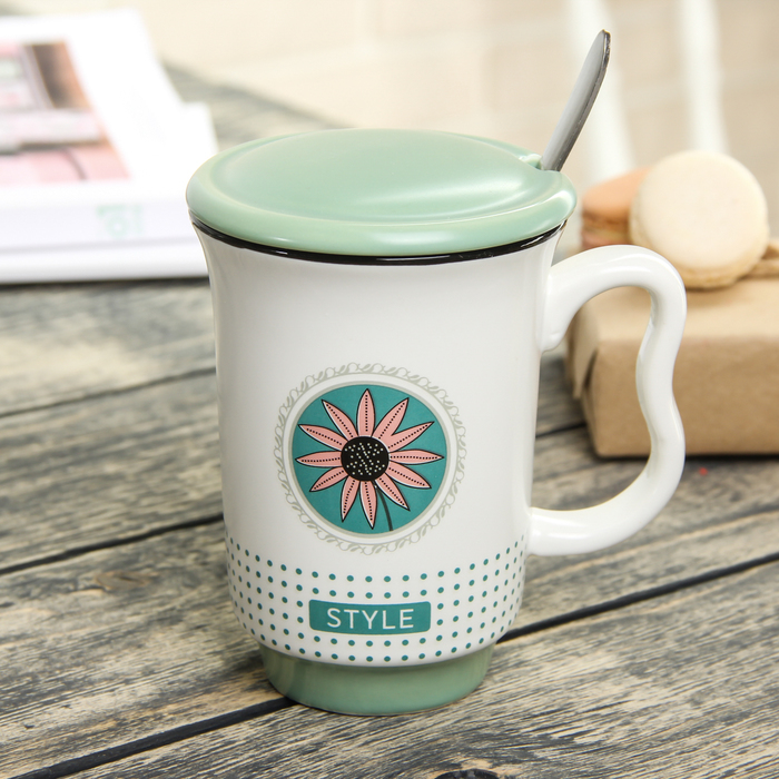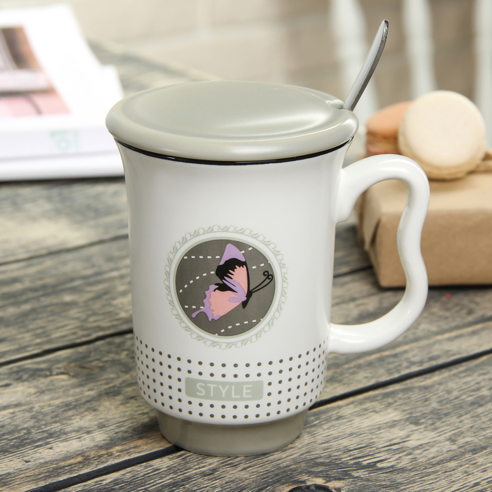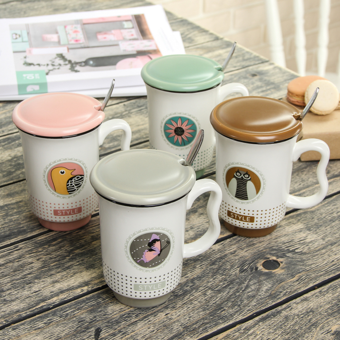 Кружка 400 мл "Стиль", с керамической крышкой и ложкой, цвета МИКС