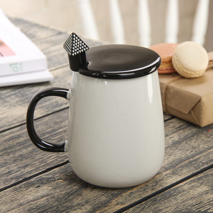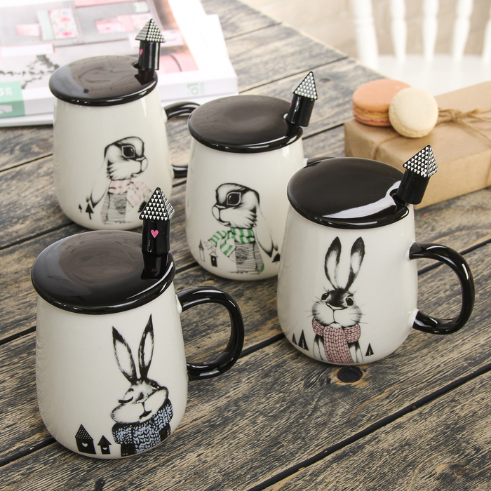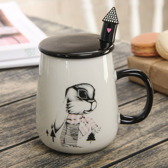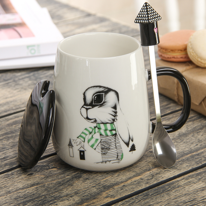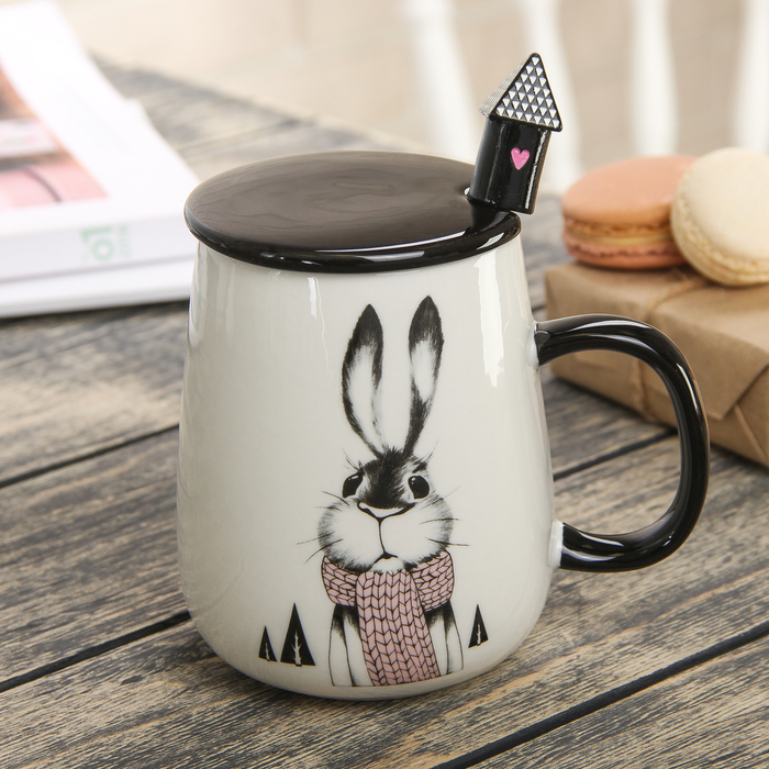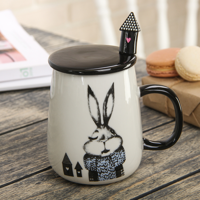 Кружка 400 мл "Зайкин дом", с керамической крышкой и ложкой, рисунок МИКС