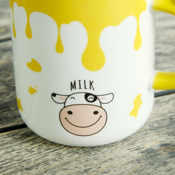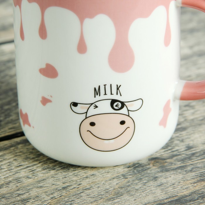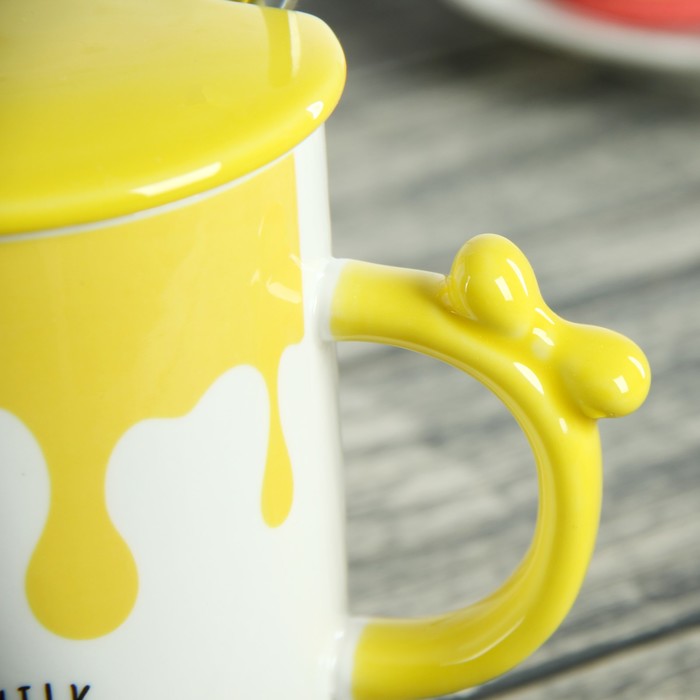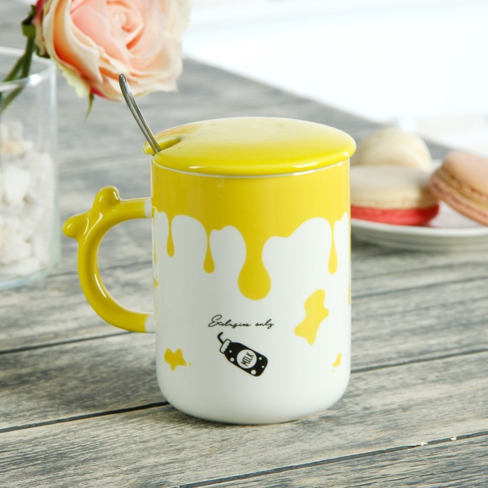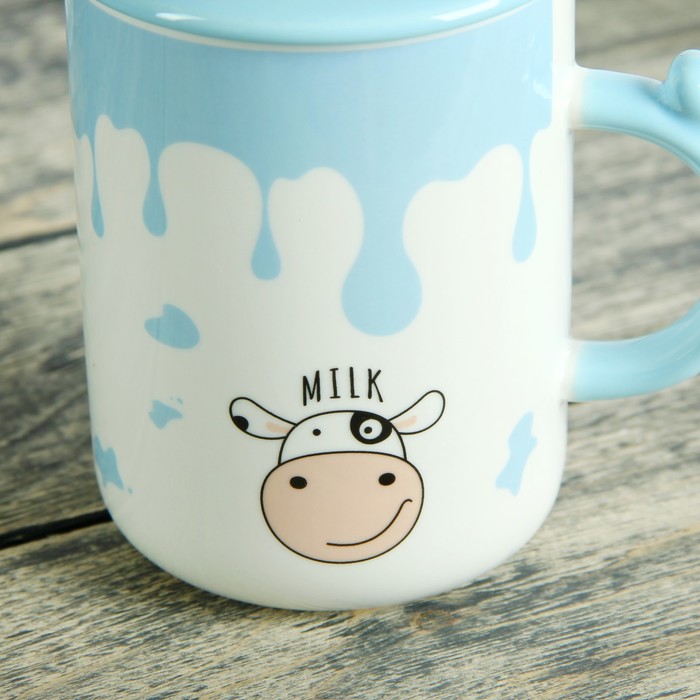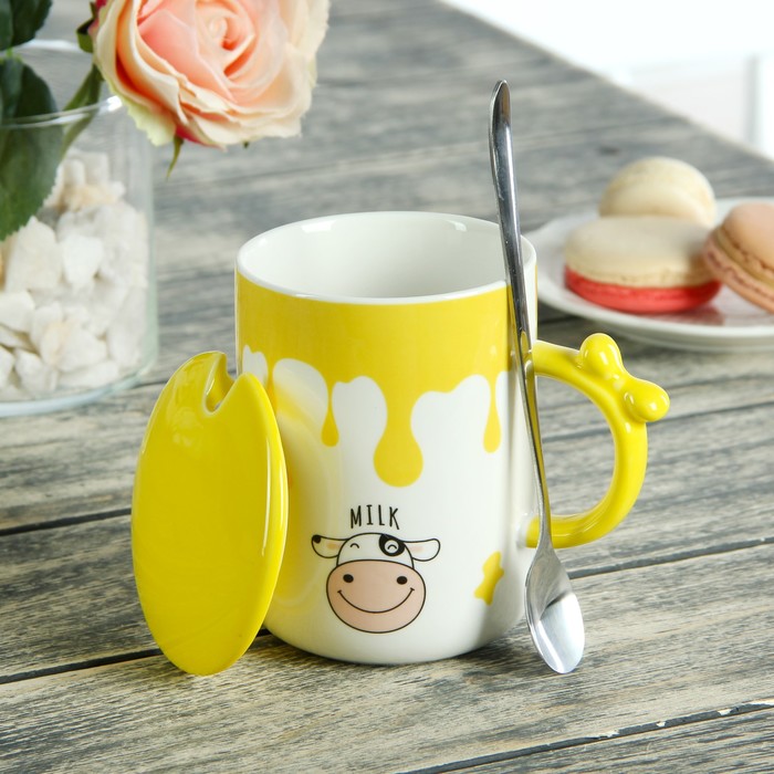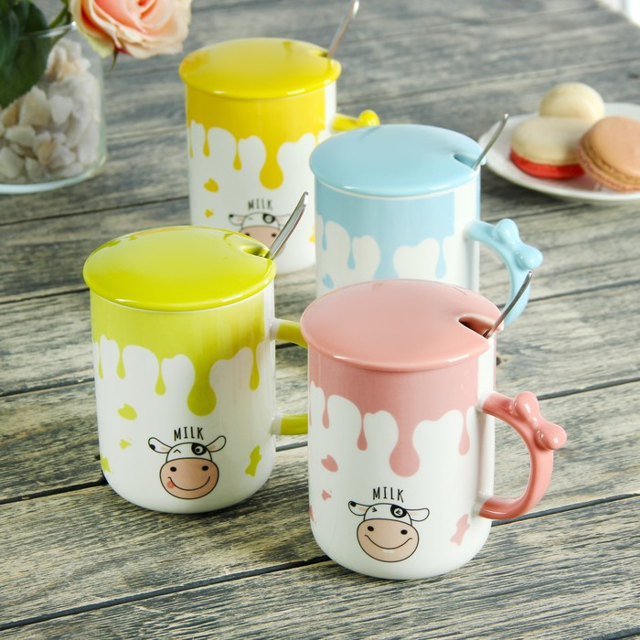 Кружка 420 мл "Буренка", с керамической крышкой и ложкой, цвета МИКС