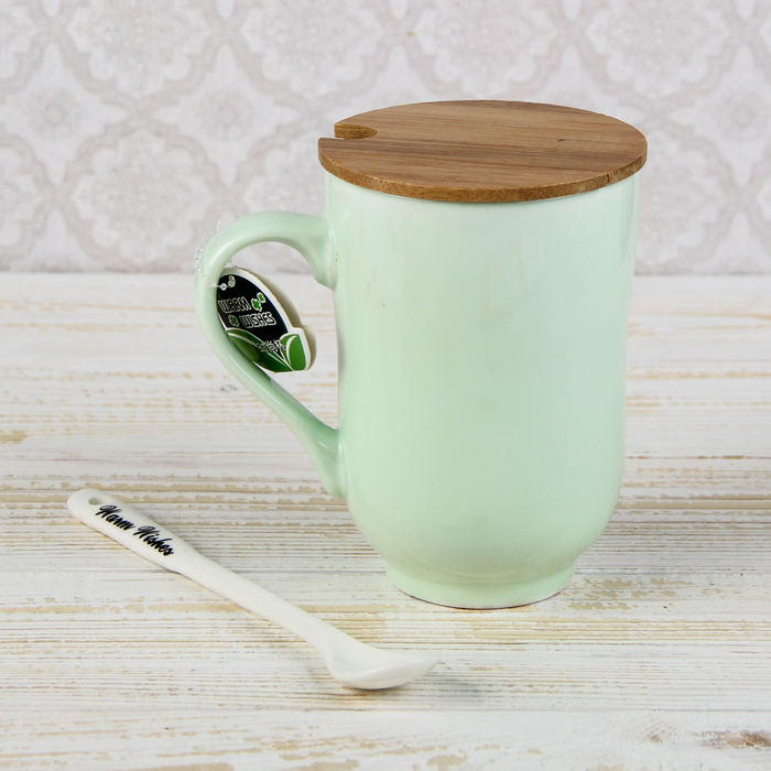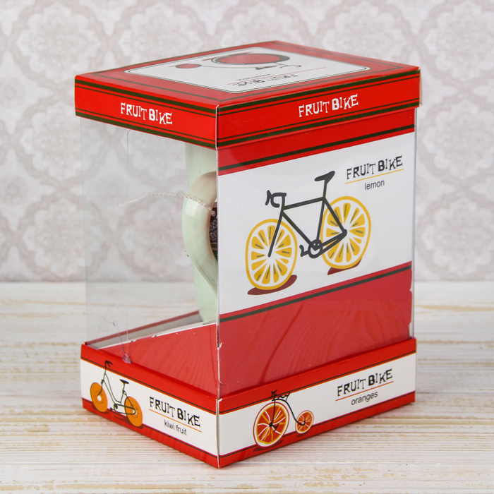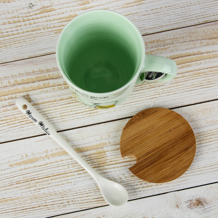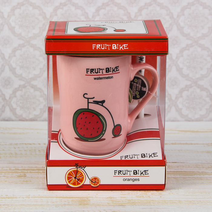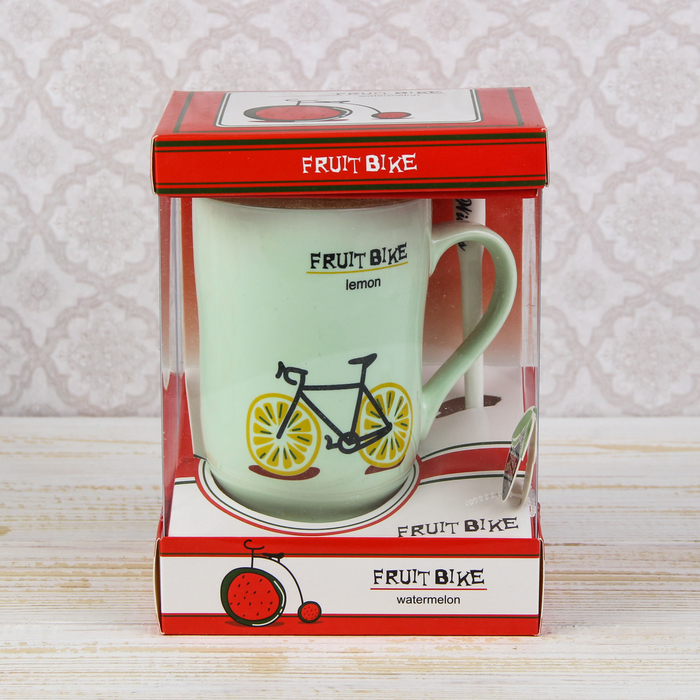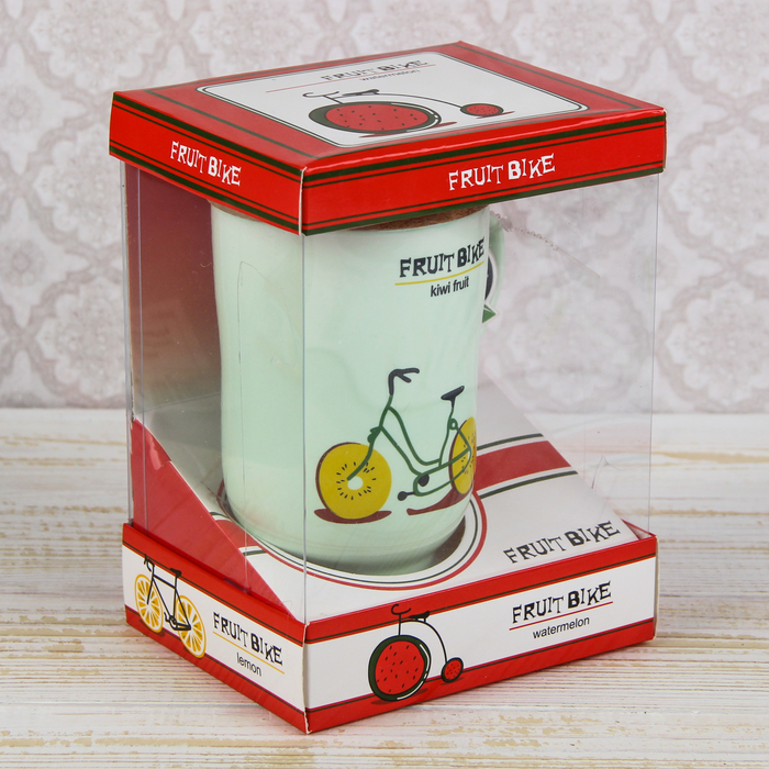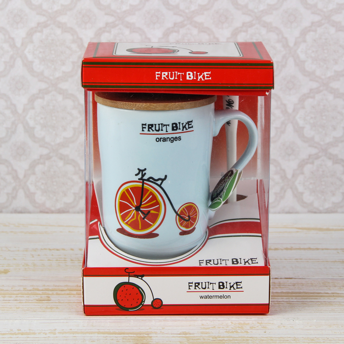 Кружка 420 мл "Фруктовый велосипед", с деревянной крышкой и ложкой, рисунок МИКС
