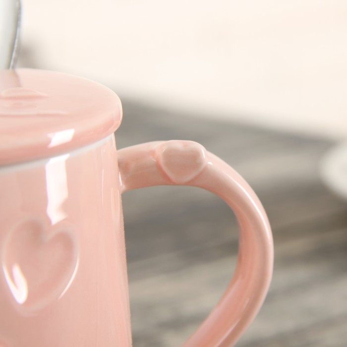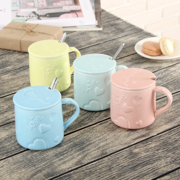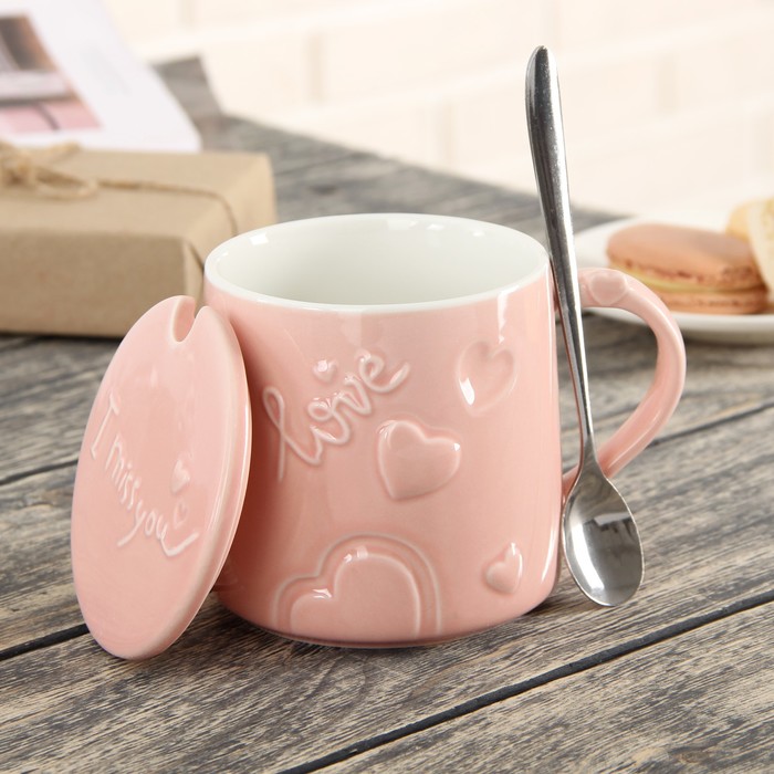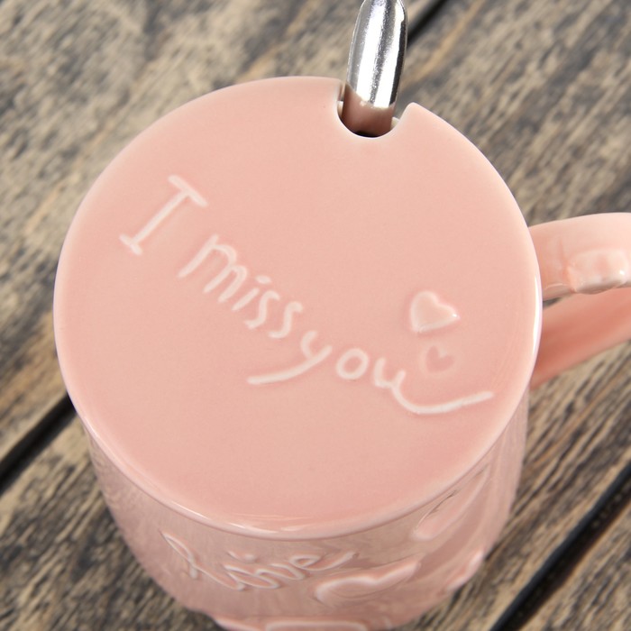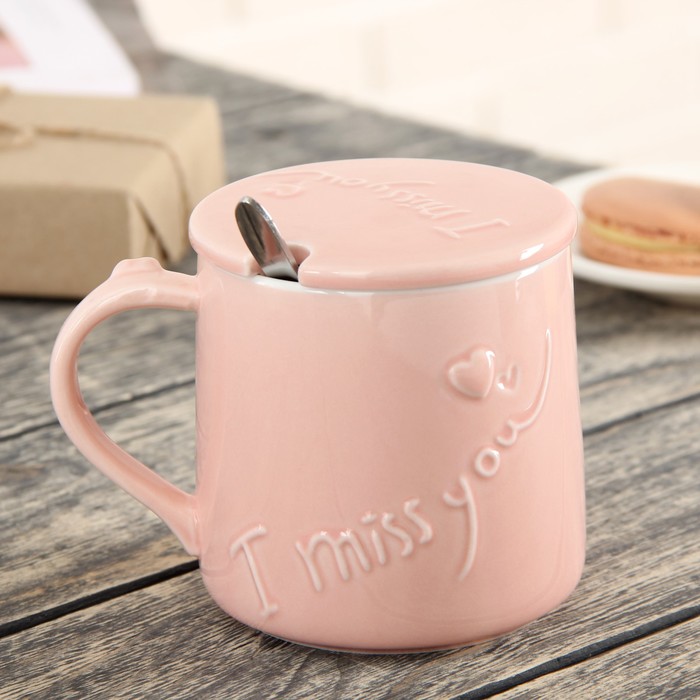 Кружка 420 мл "Скучаю по тебе", с керамической крышкой и ложкой, цвета МИКС