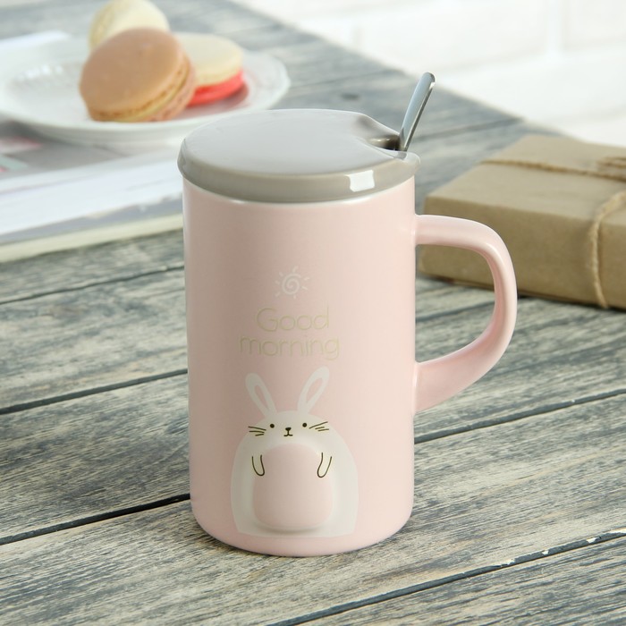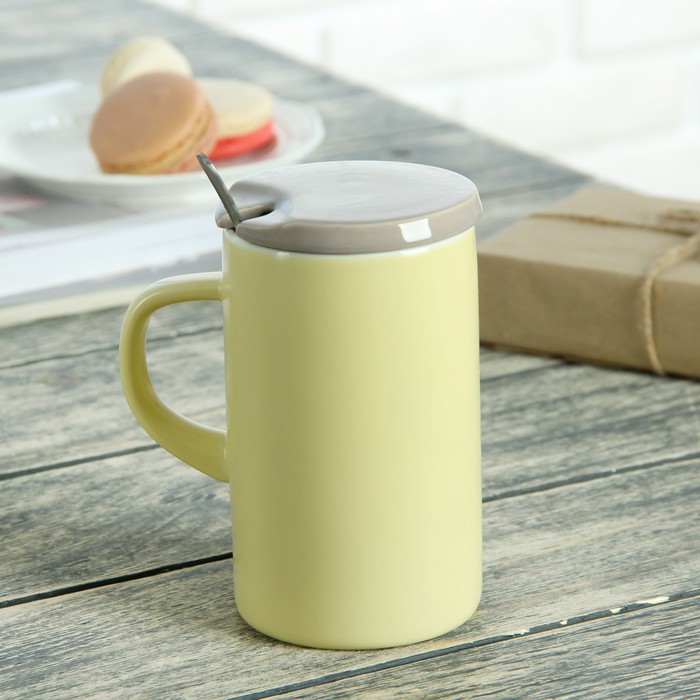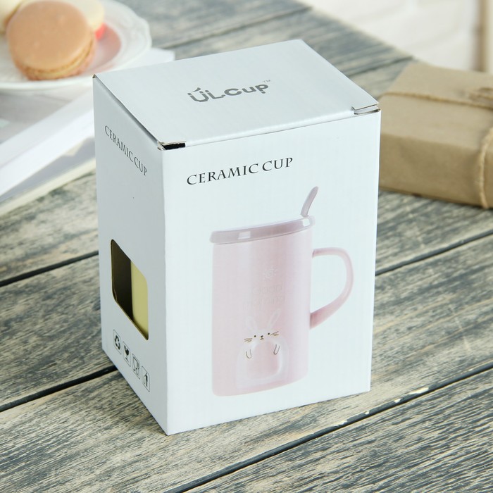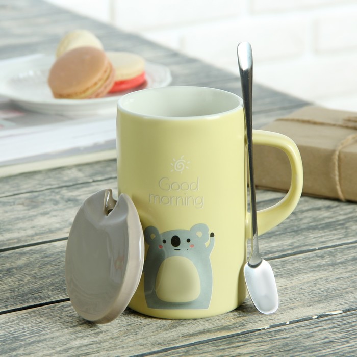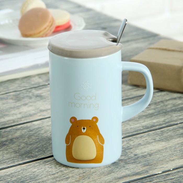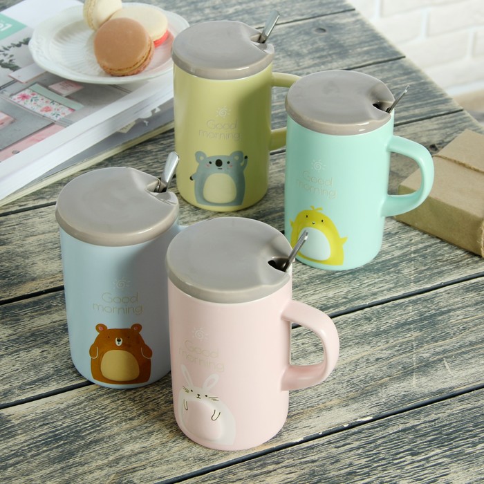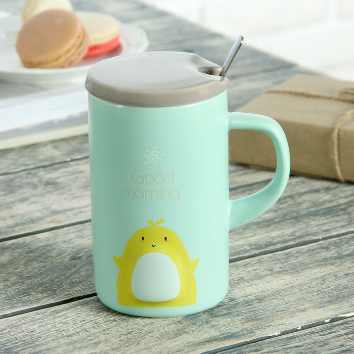 Кружка 430 мл "Толстячки", с керамической крышкой и ложкой, рисунок МИКС