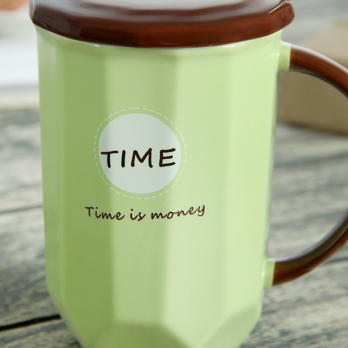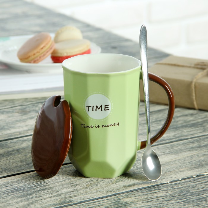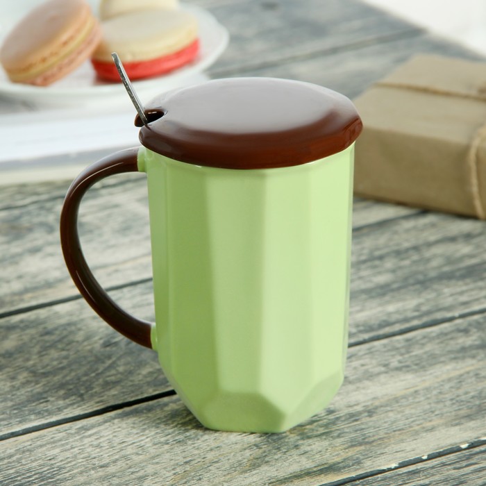 Кружка 450 мл "Чаепитие", с керамической крышкой и ложкой, цвета МИКС