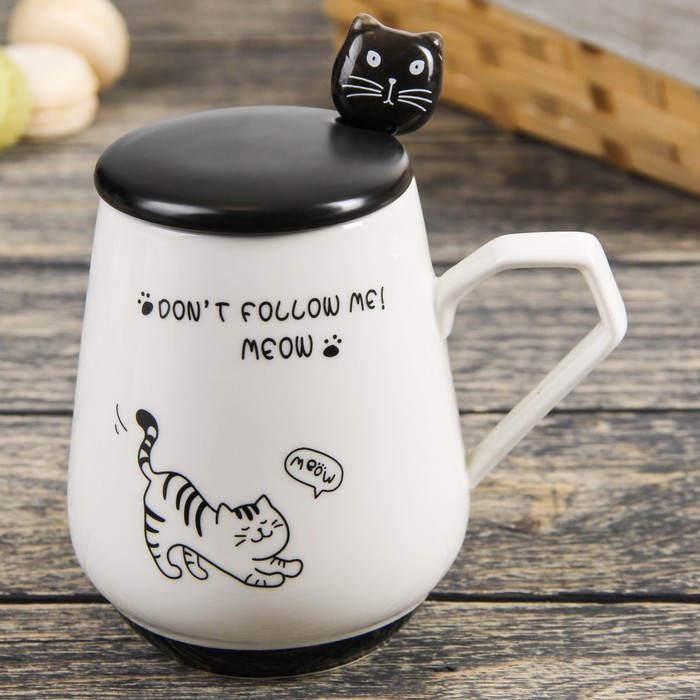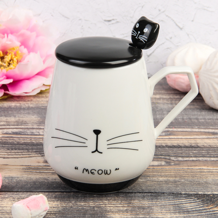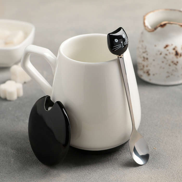 Кружка 450 мл "Котофеич", с керамической крышкой и ложкой, рисунок МИКС