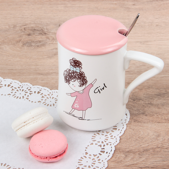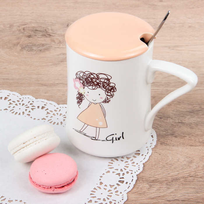 Кружка 450 мл "Мальчик и девочка", с ложкой и крышкой, цвета МИКС