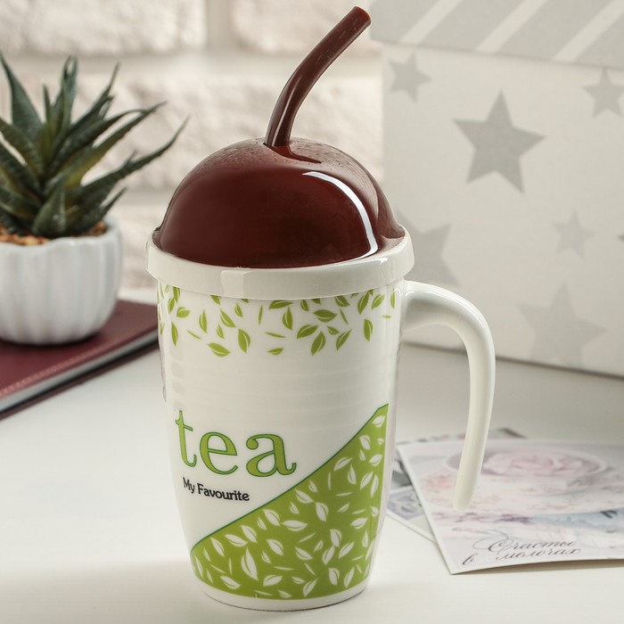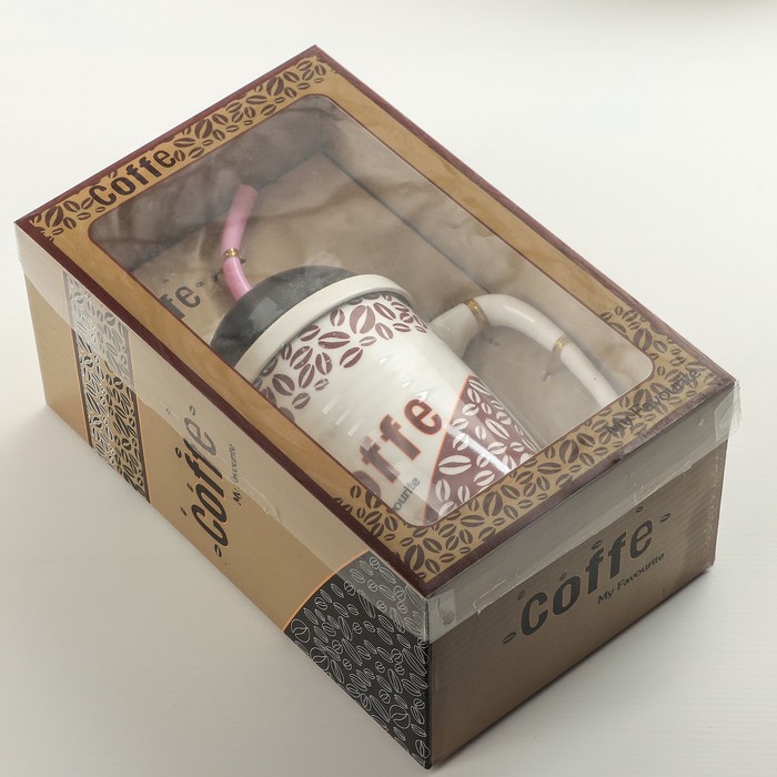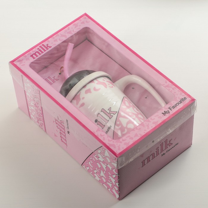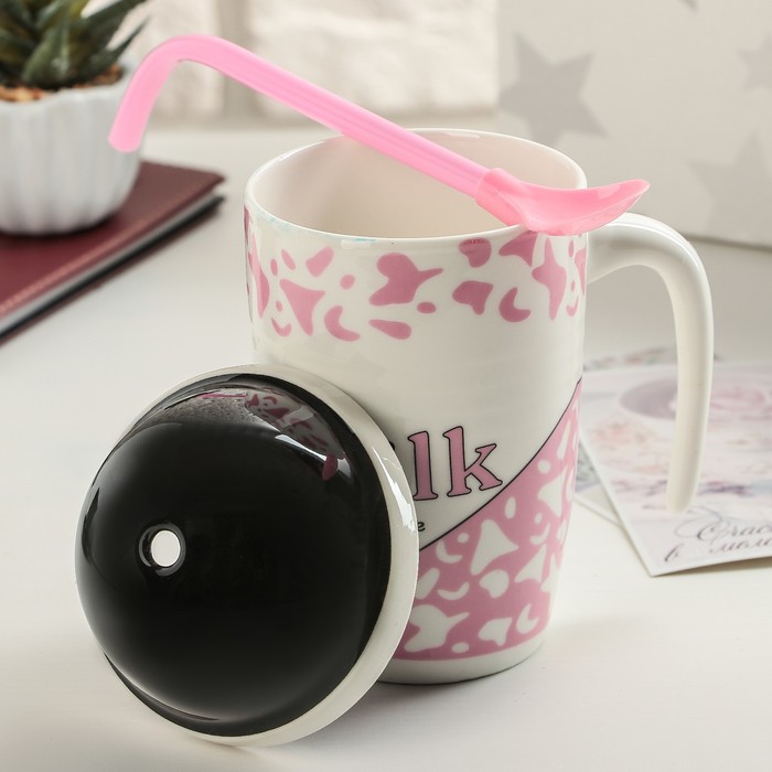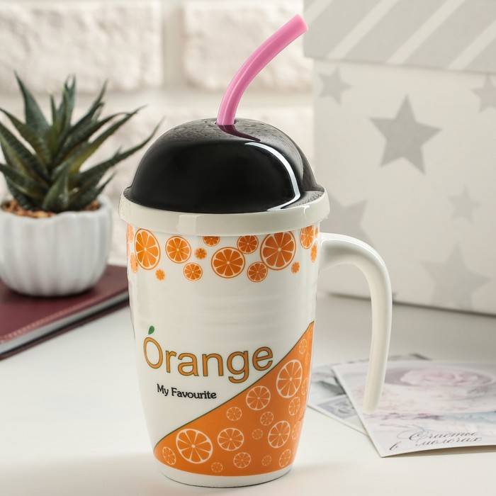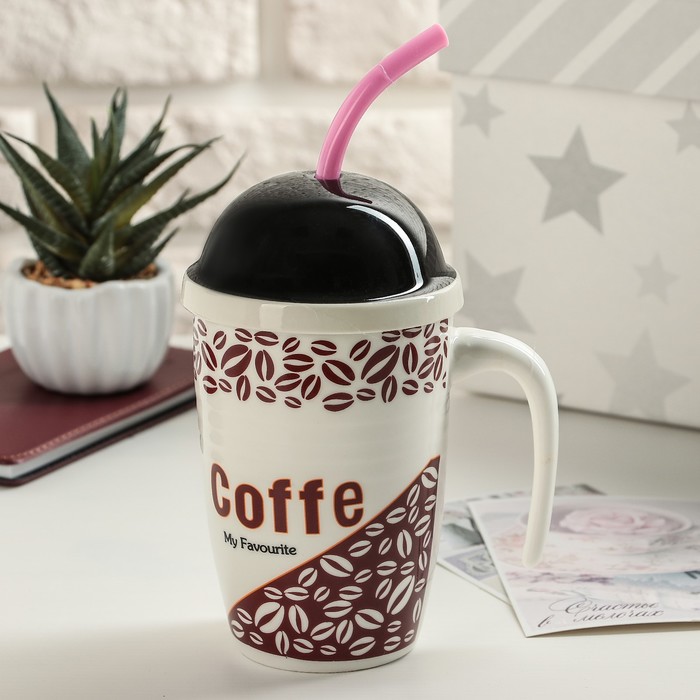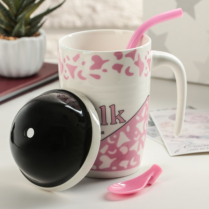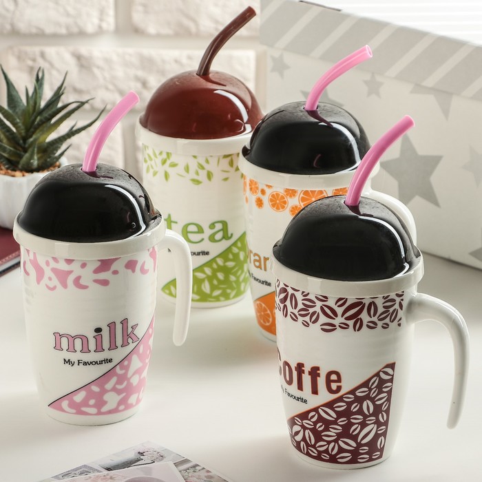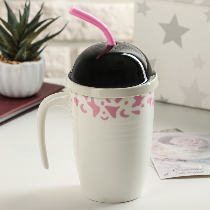 Кружка 450 мл "Молочный путь", с керамической кышкой и трубочкой, рисунок МИКС