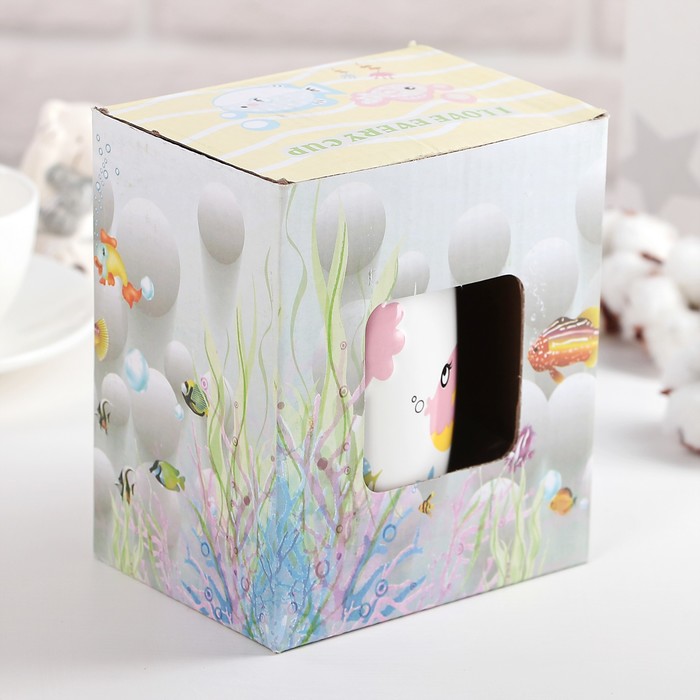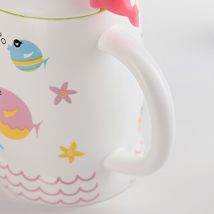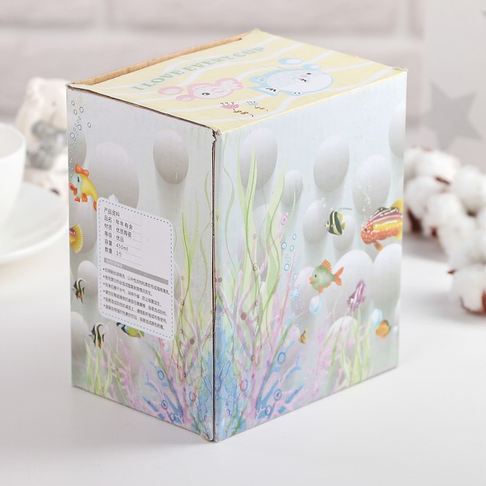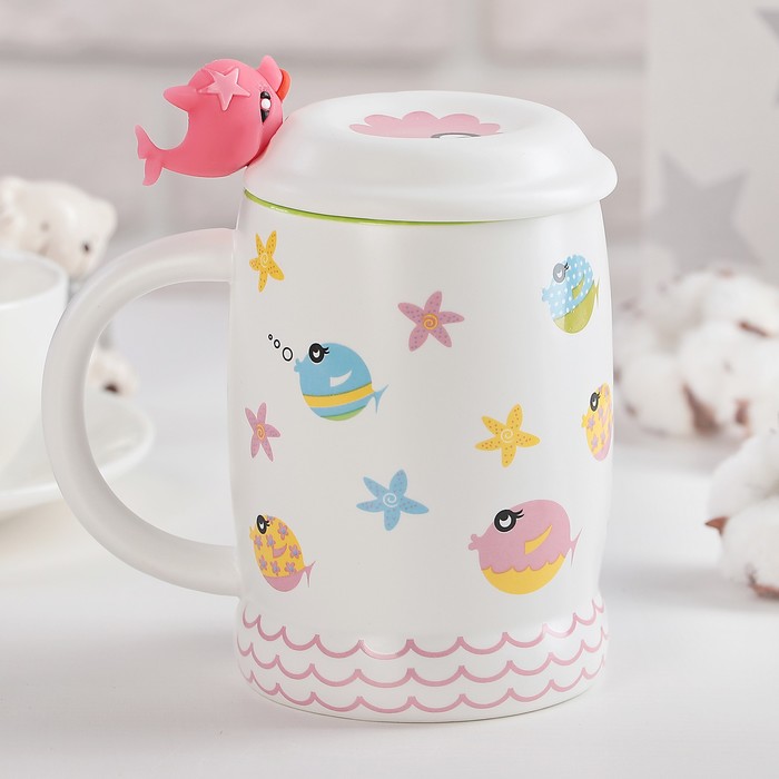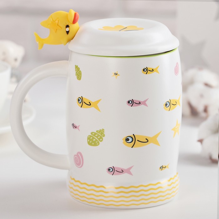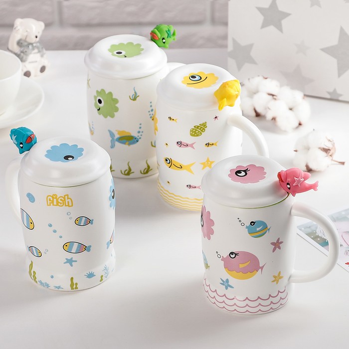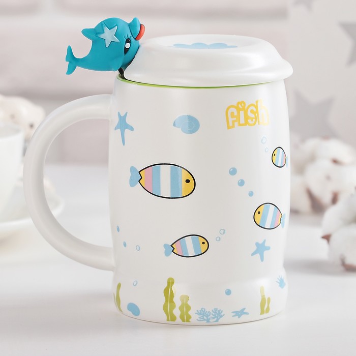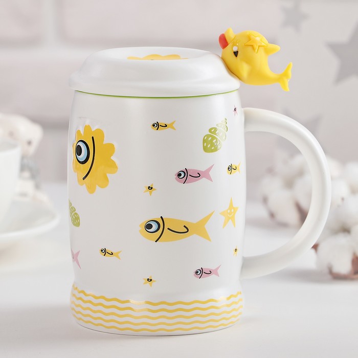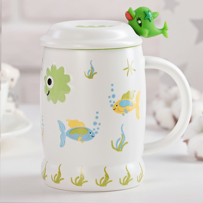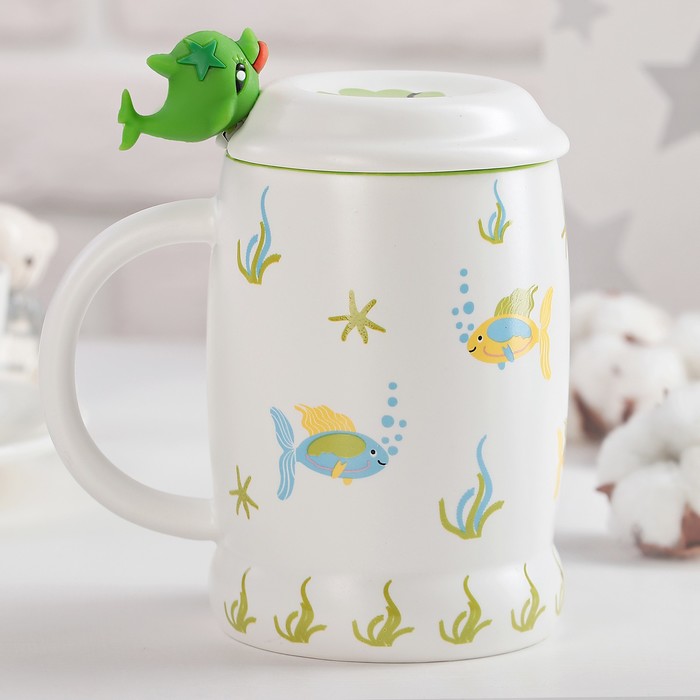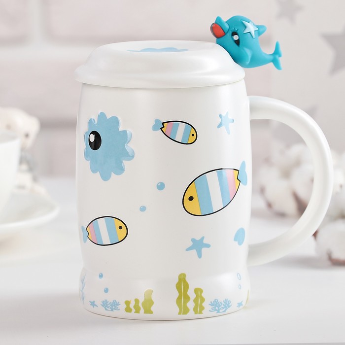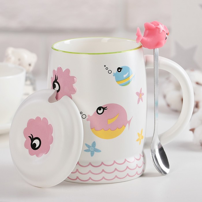 Кружка 450 мл "Морской мир", с крышкой и ложкой, рисунок МИКС