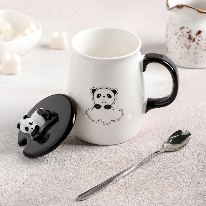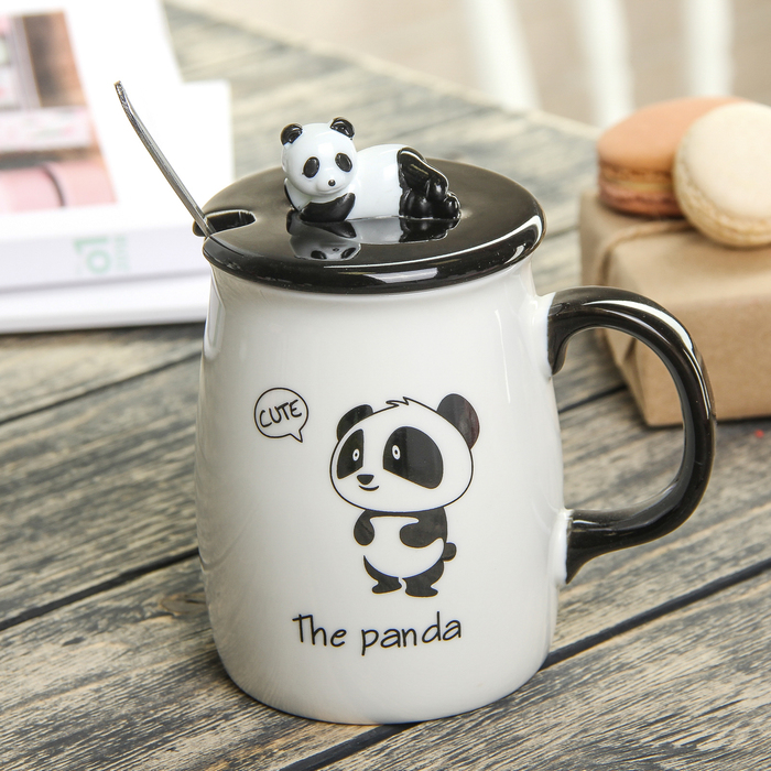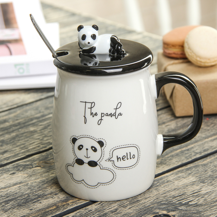 Кружка 450 мл "Привет панда", с керамической ложкой и крышкой, рисунок МИКС