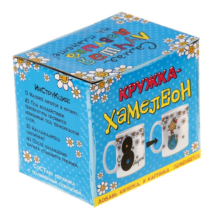 На первый взгляд - это обычная керамическая кружка, но она таит в себе маленький секрет. Стоит только налить любимый горячий напиток, как кружка моментально начнет менять свой рисунок. Такой эффект достигается, благодаря специальным термочувствительным краскам, которые при нагревании становятся прозрачными.
