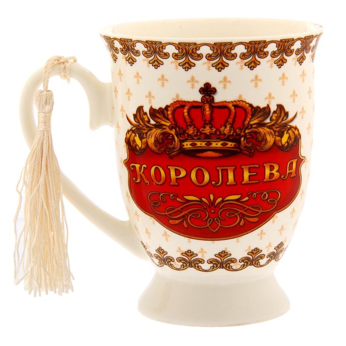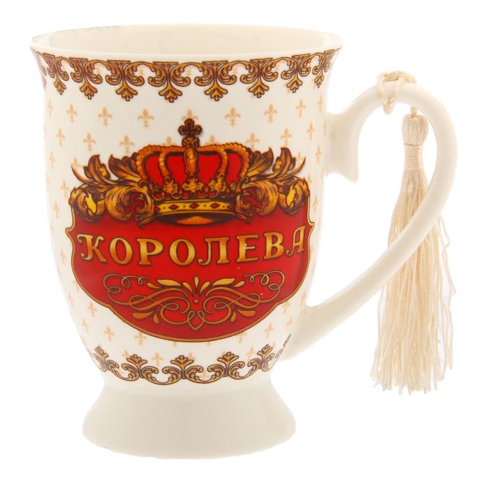 Выполненная в нежном и утончённом дизайне кружка "Королева", 300 мл станет неповторимым подарком, достойным любого повода. Очаровательный орнамент превратил простой предмет посуды в настоящее художественное произведение с тёплыми словами и пожеланиями в центре изделия. Лёгкая игривая кисточка на ручке придаёт изделию восхитительный шарм.