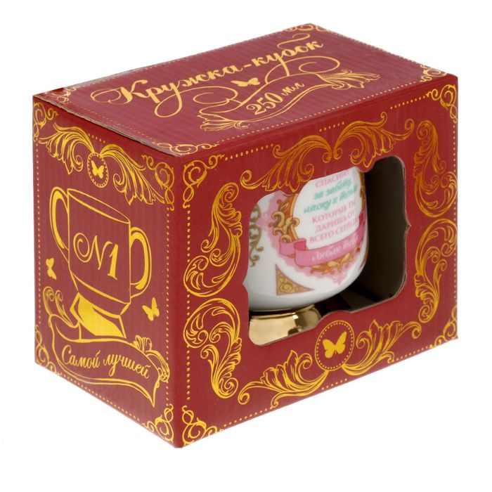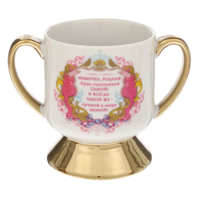 Кружка-кубок — новый способ поделиться самыми нежными чувствами. Необычный предмет из керамики станет чудесным подарком близкому человеку. Поверхность украшена вензельным рисунком и надписью с тёплыми словами. Такой кубок можно поставить на самое видное место в доме или пить из него чай или компот.