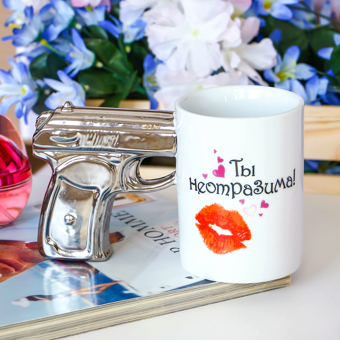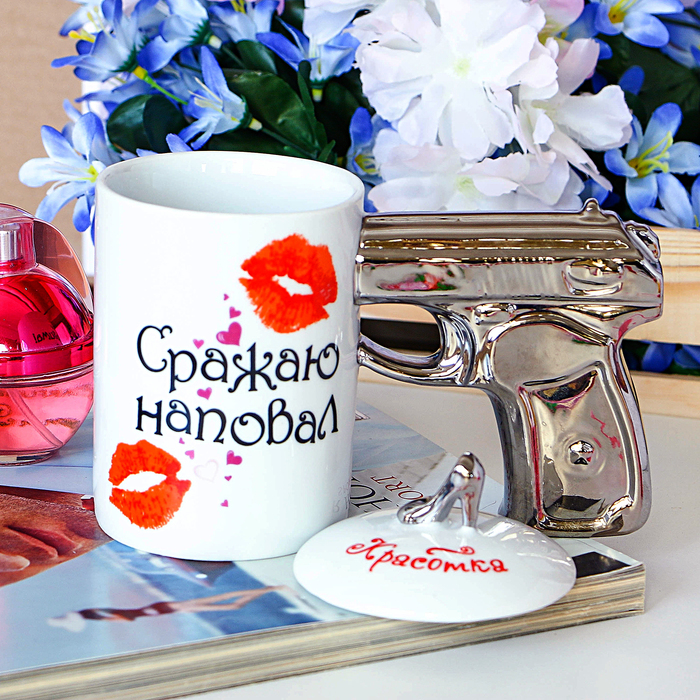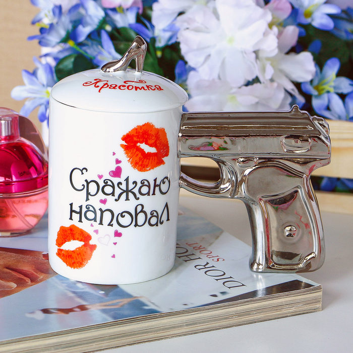 Вы думаете, кружка с массивной ручкой в виде пистолета подходит только брутальным мужчинам? А вот и нет! Такая кружка создана для очаровательных представительниц прекрасного пола, любящих высокие шпильки, длинные локоны, яркую помаду и стильный образ. Оригинальная кружка, крышку которой украшает ручка в виде изящной туфельки, будет приятным сюрпризом для девушки к 8 марта, Новому году или дню Рождения.