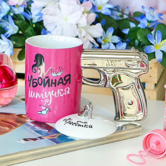 Вы думаете, кружка с массивной ручкой в виде пистолета подходит только брутальным мужчинам? А вот и нет! Такая кружка создана для очаровательных представительниц прекрасного пола, любящих высокие шпильки, длинные локоны, яркую помаду и стильный образ. Оригинальная кружка, крышку которой украшает ручка в виде изящной туфельки, будет приятным сюрпризом для девушки к 8 марта, Новому году или дню Рождения.