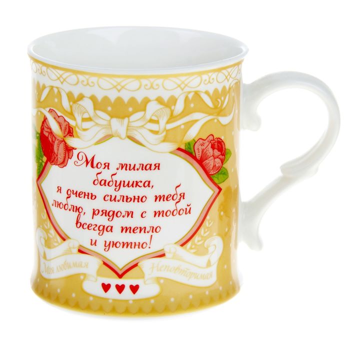 Создайте атмосферу торжественного поздравления, которую виновник торжества будет вспоминать еще долгое время. В этом вам поможет кружка-похвала "Любимая бабушка", 250 мл. Наши дизайнеры специально создали идеальную награду для достойных: матовое декорирование с роскошными золотыми элементами, ручка в классическом стиле – роскошный презент для ценителей искусства. Оригинальный дизайн и теплые, приятные пожелания подчеркивают значимость человека, которому вручается этот презент.