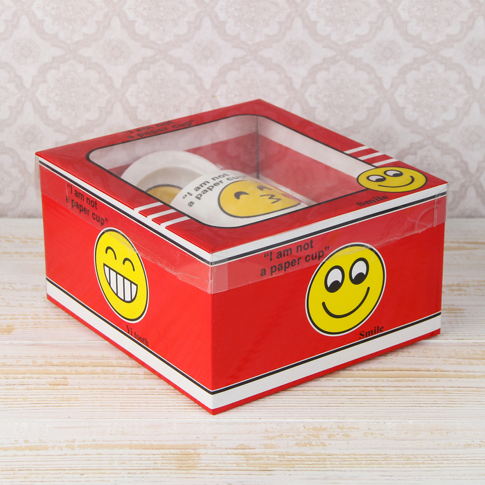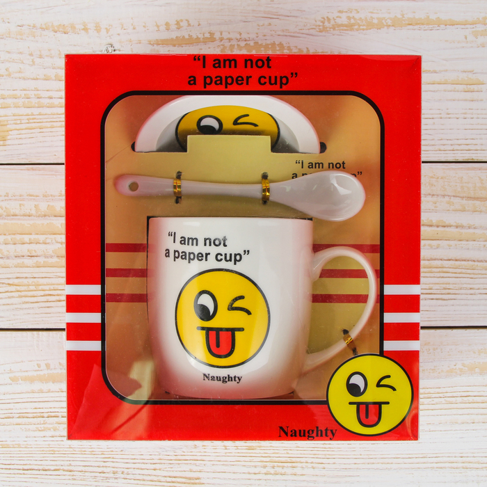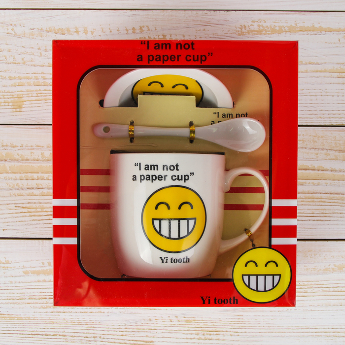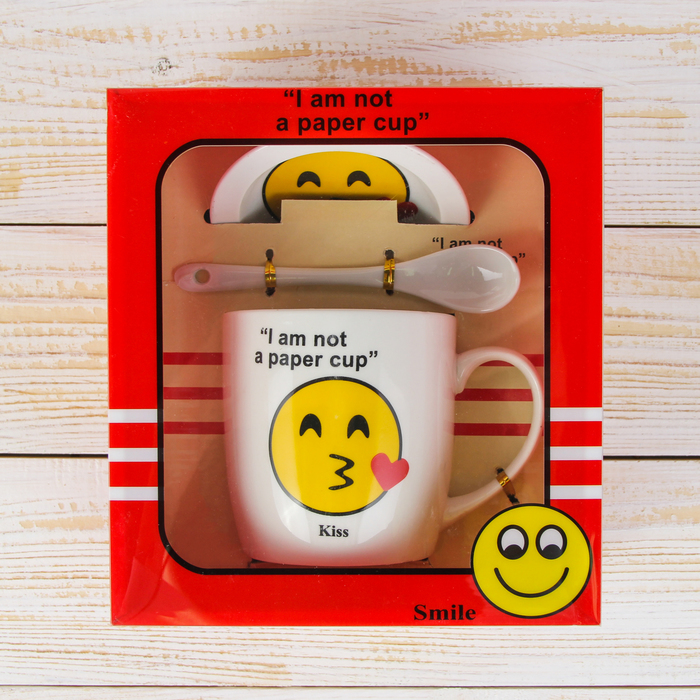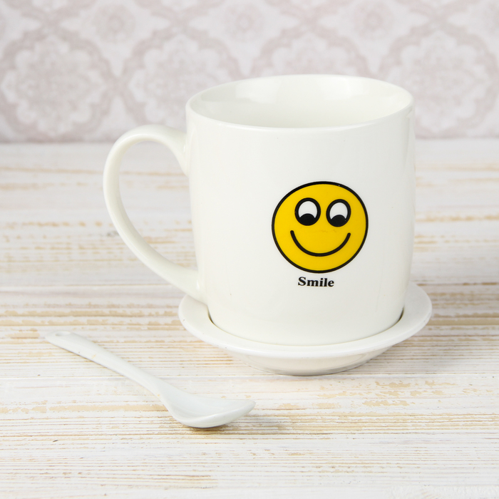 Кружка с подставкой и ложкой "Мордашки", рисунок МИКС