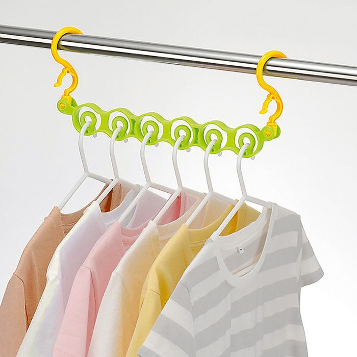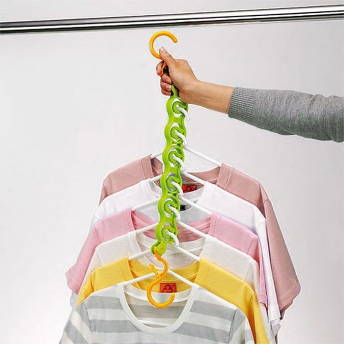 Повесьте данный крючок на перекладину или установите его между другими вешалками. Теперь вы сможете присоединить к нему до шести плечиков.