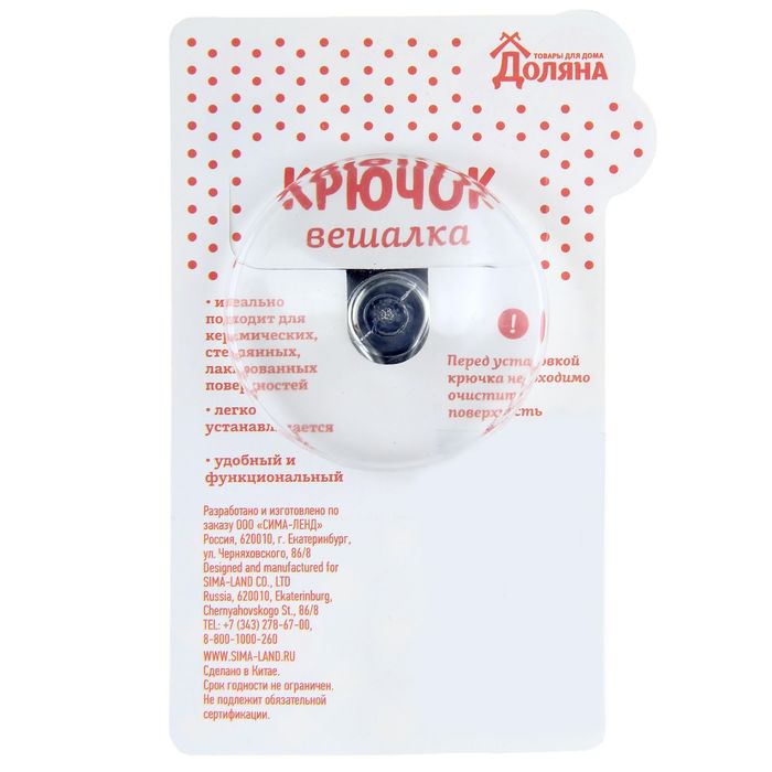 Крючок на присоске "Милый дом" - отличный помощник на кухне, в ванной или в любом другом помещении. Крепится на любую гладкую поверхность быстро и без хлопот всего за пару минут. Не требует гвоздей или шурупов для установки, следовательно, не портит поверхность при демонтаже. Просто очистите плоскость и прилепите его, с усилием надавливая в течение нескольких секунд.