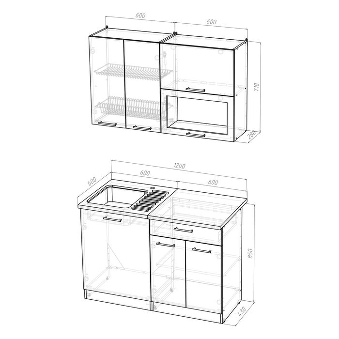 - Кухонная мойка, стеновая панель, посудосушитель в комплект не входят.