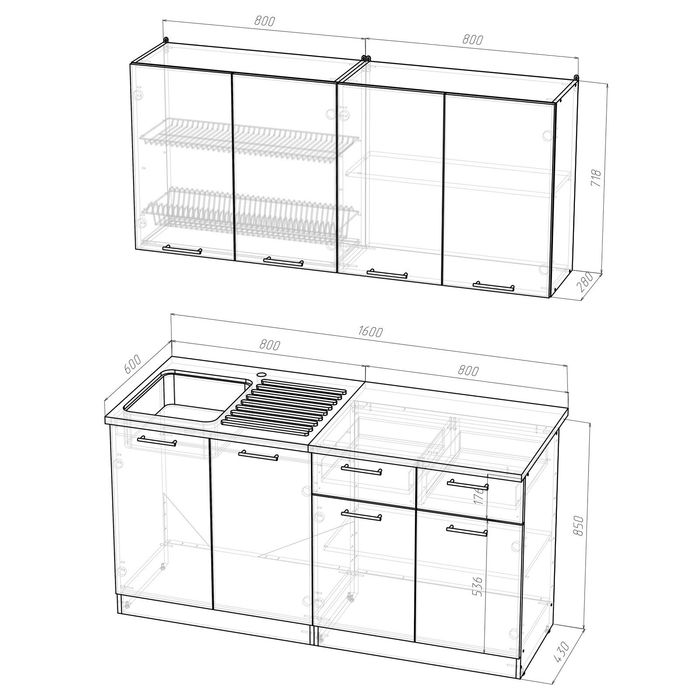 - Кухонная мойка, стеновая панель, посудосушитель в комплект не входят.