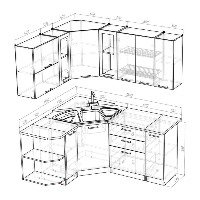 - Кухонная мойка, стеновая панель, посудосушитель в комплект не входят.