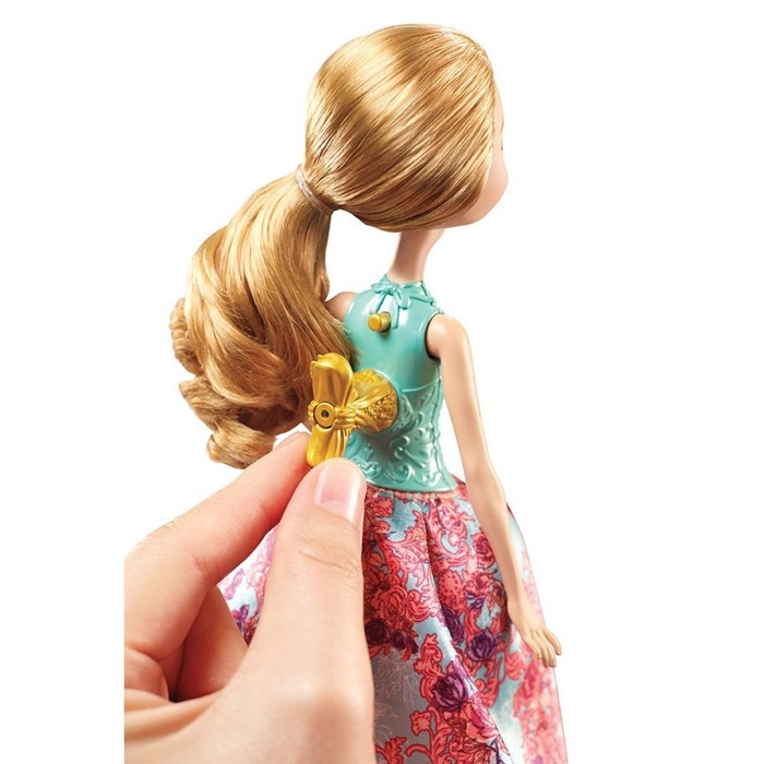 Принцесса Эшлин Элла — дочь Золушки, и трансформирующееся платье подходит ей как нельзя кстати! Дневной наряд куклы состоит из пышной юбки до колен и зелёного топа в тон. Чтобы сделать образ бальным, нужно повернуть ключ в спинке, тогда юбка превратится в длинный и объёмный подол платья. Осталось надеть розовый корсет, сделать красивую причёску, украсить её короной, и можно смело отправлять принцессу на торжество!