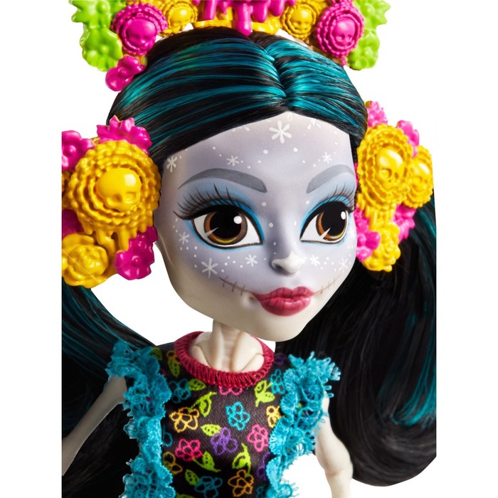 В отличие от игрового варианта, у коллекционной Скелиты более изящные рисунки на лице с мягкими и плавными переходами благородных пепельных цветов. Густые чёрные волосы с изумрудными прядями собраны в два хвоста. Отдельного внимания заслуживают массивные головные украшения в виде красочных цветов и черепов, придающие кукле вид истинной королевы праздника.