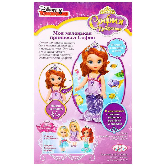 Порадуйте девочку куколкой «Принцесса София в одежде русалочки»! Игрушка рассказывает 3 стихотворения и поёт песенку милым детским голосом. Кукла создана по мотивам эпизода «Плавучий дворец» и наряжена в платье с подолом, похожим на русалочий хвост. На лифе есть амулет, нажав на который, девочка включит звуковое устройство.