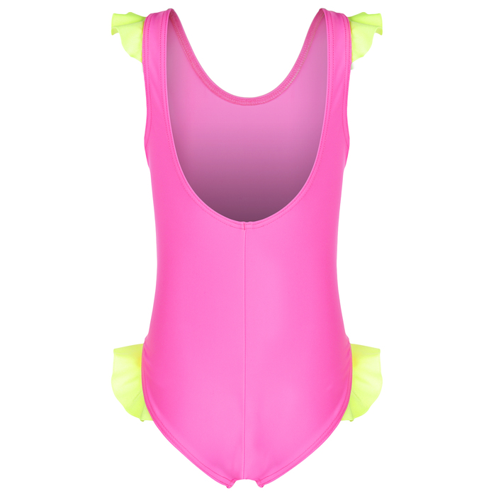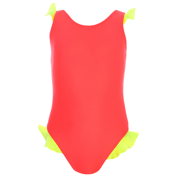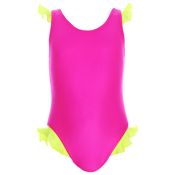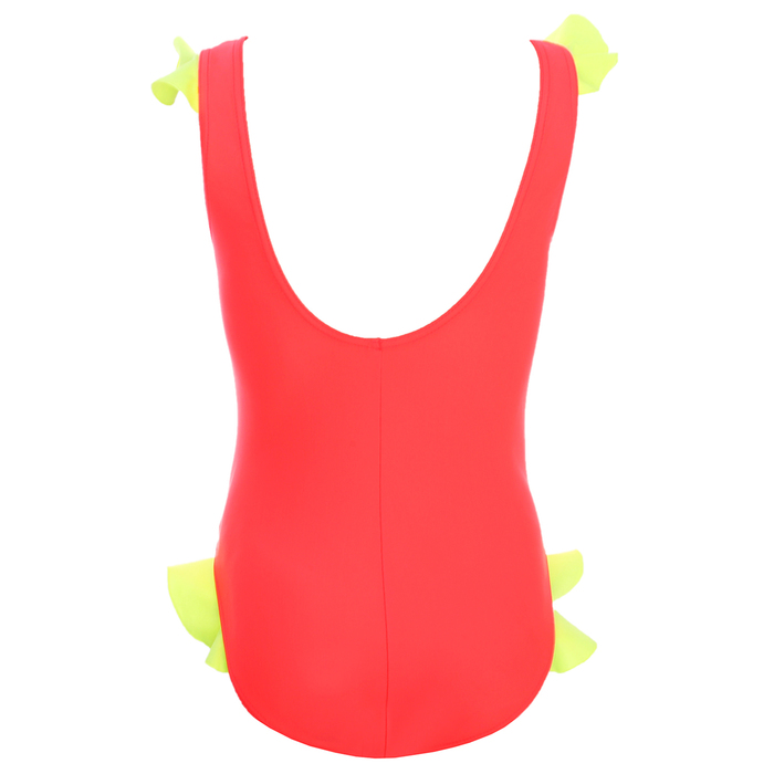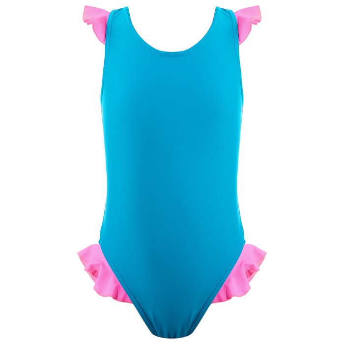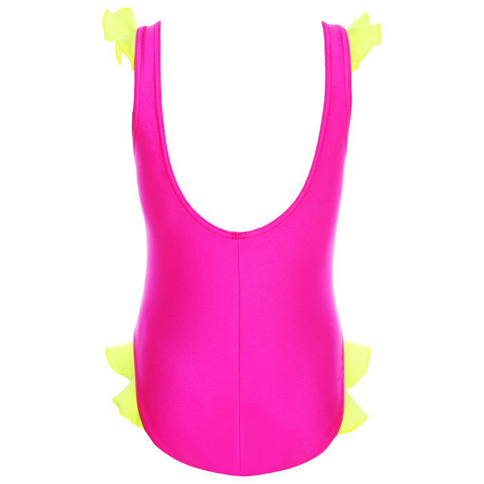 Купальник подходит для регулярных тренировок в бассейне. Изделие из эластичной и плотной ткани хорошо облегает тело спортсмена и улучшает гидродинамические свойства. Купальник имеет широкие бретели, декоративный фигурный вырез на спинке и отделку рюшами, которые делают образ нежным и игривым.