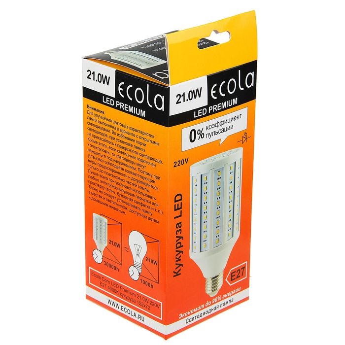 Лампа Ecola в форме кукурузы предназначена для основного и акцентного освещения жилых и офисных помещений. Изделие равномерно распределяет излучение, создаёт атмосферу уюта и позволяет читать, не напрягая зрительную систему. Потребляет на 90 % меньше электроэнергии, чем лампа накаливания. Подходит для приборов с цоколем E27.