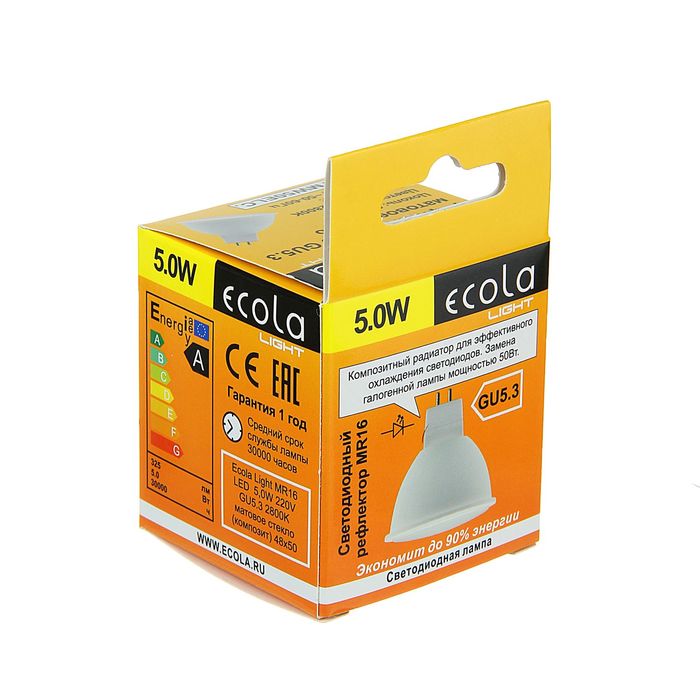Ecola Light подходят для замены галогенных и зеркальных ламп накаливания в приборах с аналогичным цоколем. Изделие имеет композитный радиатор, который отводит тепло от светодиодов.