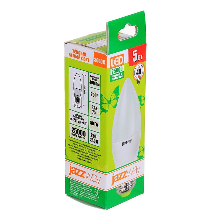 Лампа светодиодная Jazzway, C37, E27, 5 Вт, 400 Лм, 3000 K, PLED-ECO