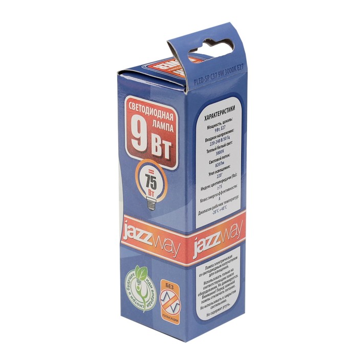 Лампа светодиодная Jazzway, C37, E27, 9 Вт, 820 Лм, 3000 K, PLED-SP