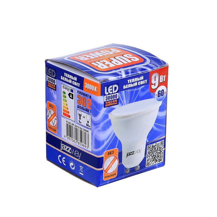 Лампа светодиодная Jazzway, MR16, GU10, 9 Вт, 720 Лм, 3000 K, PLED-SP