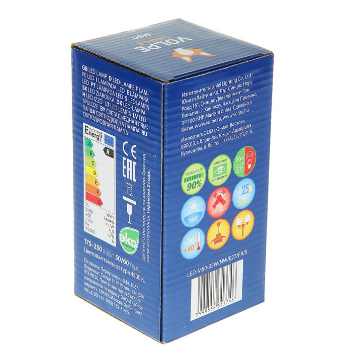 Светодиодная лампа Volpe M80 предназначена для осветительных приборов в жилых помещениях, а также для уличных фонарей. Работает при низких и высоких температурах. Изделие по качеству излучения схоже с лампой накаливания мощностью 260 Вт, при этом до 90 % экономичнее.