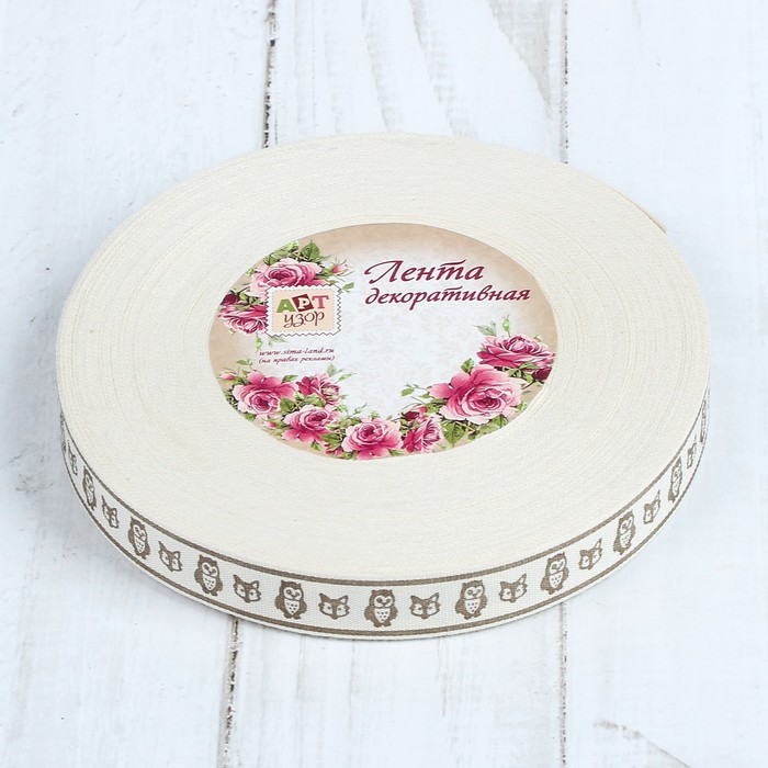 Лента хлопковая "Сова, лисичка", 15мм, 23±1м, цвет белый/коричневый